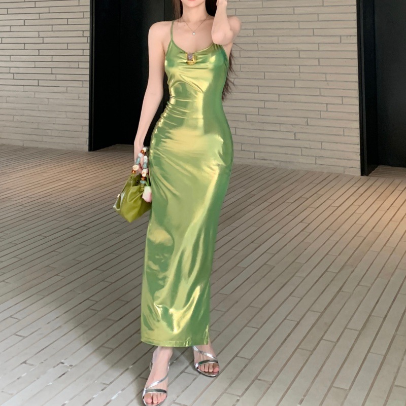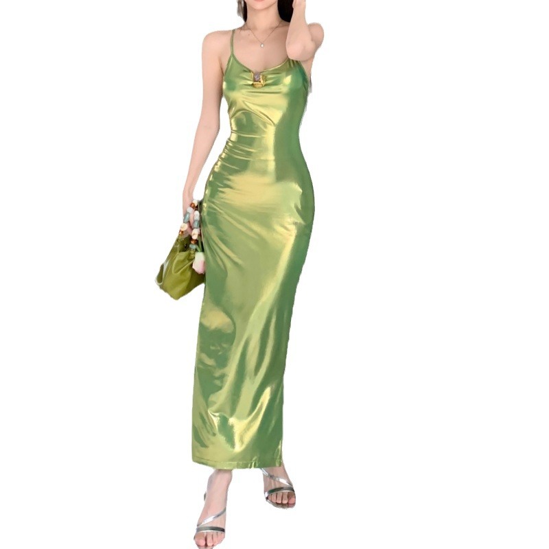 春夏新款度假风绿灯泡亮面质感开衩修身性感吊带连衣裙女长裙