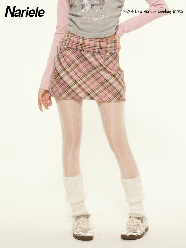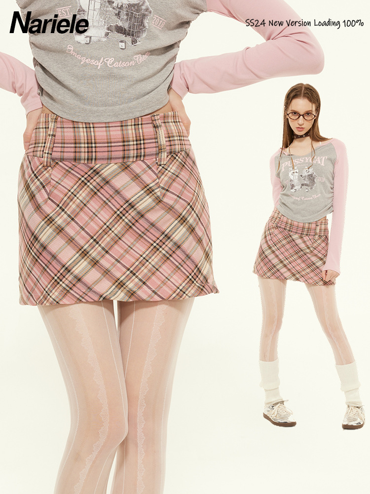 Nariele 欧美格子半身裙春夏港风粉色高腰显瘦包臀裙A字短裙