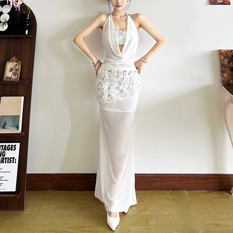 跨境欧美风新款女装挂脖荡领背心裹胸打底套装拼接半身裙