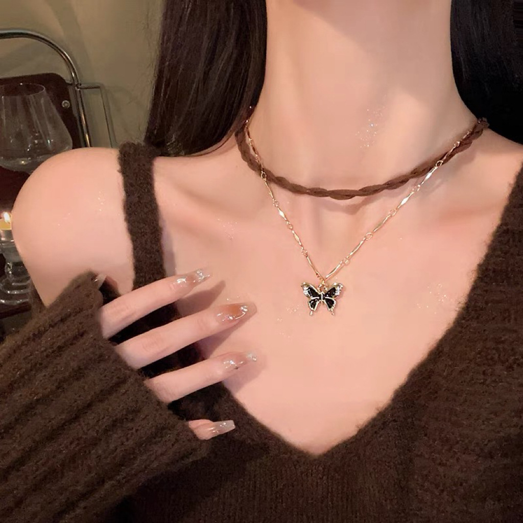 美拉德甜酷风双层叠戴滴油黑蝴蝶项链饰品女高级感麻花韩国绒项圈