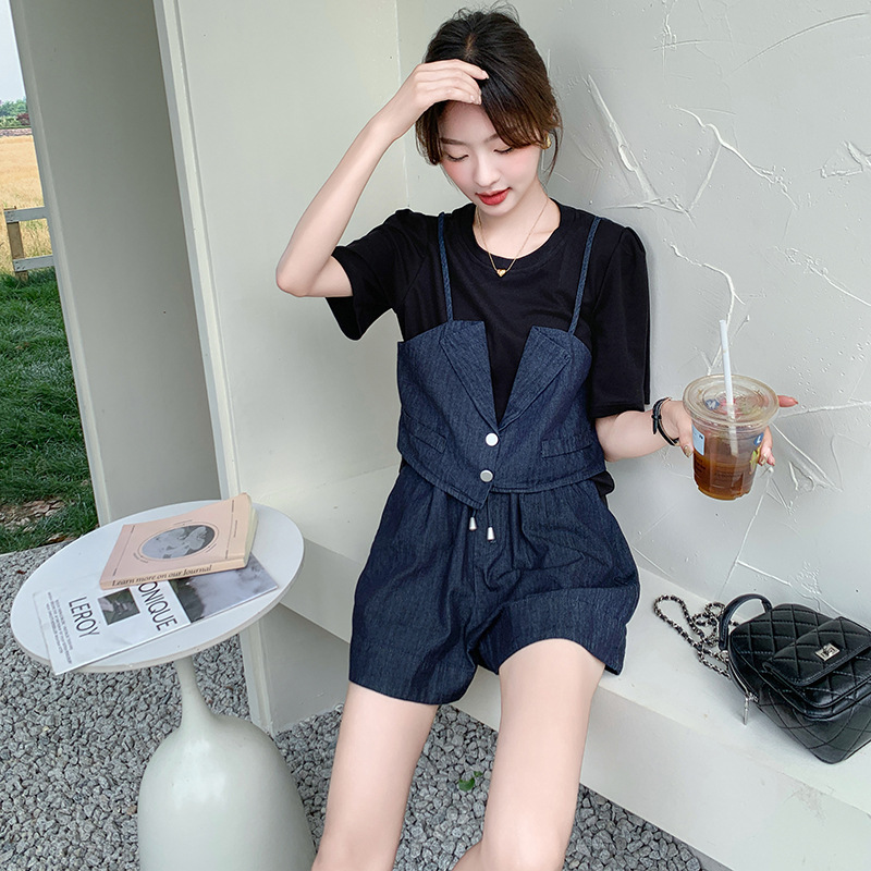 韩版拼接假两件上衣短裤套装女夏季新款时尚减龄短款两件套