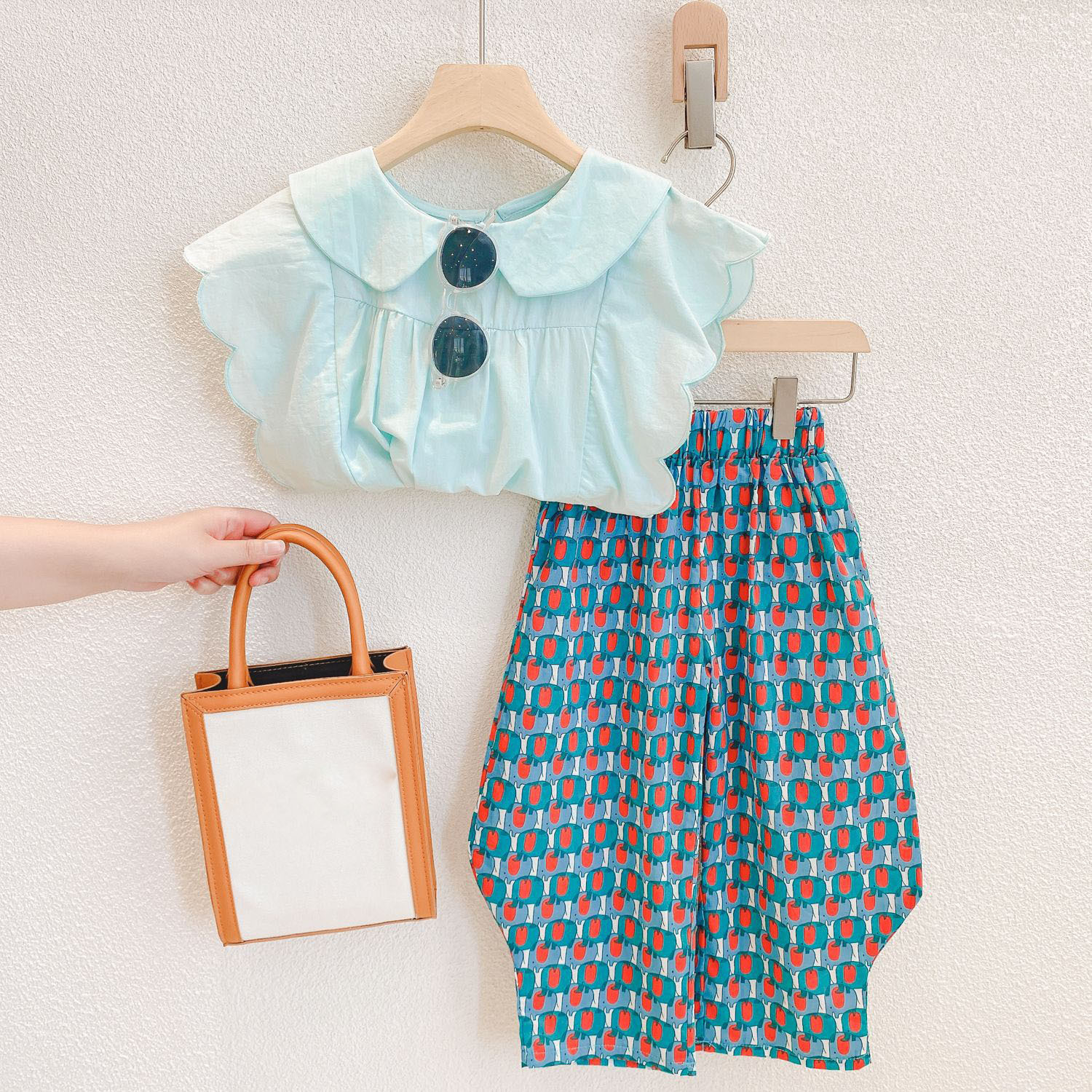 女童夏装套装2025夏季新款儿童时髦洋气女宝宝娃娃领阔腿裤两件套