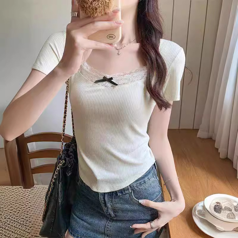 螺纹短袖T恤女夏季新款显瘦蕾丝花边设计感纯欲修身短款上衣ins潮