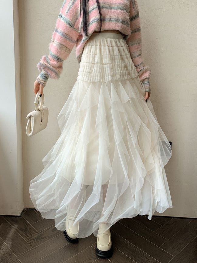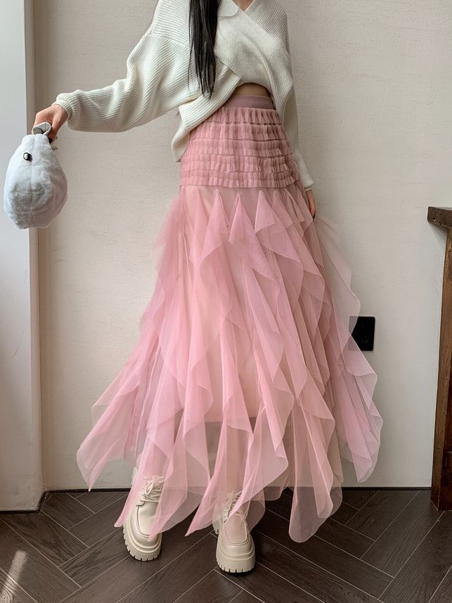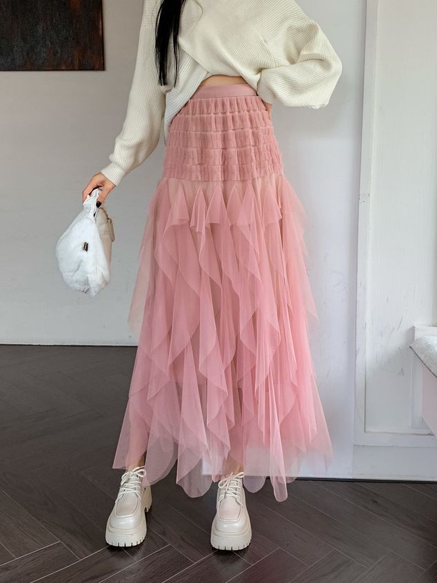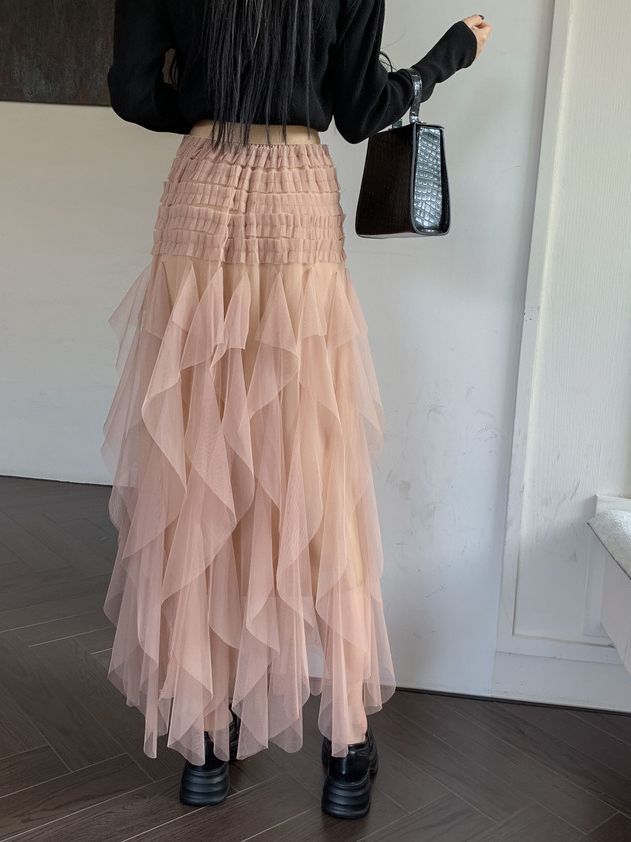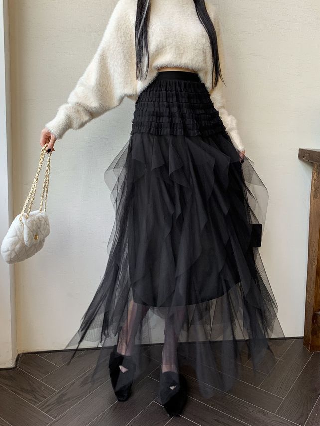 网纱半身裙女春夏新款蛋糕裙不规则高腰蓬蓬纱裙长裙
