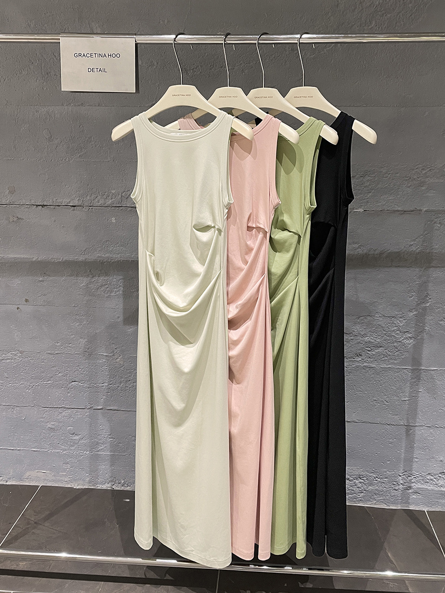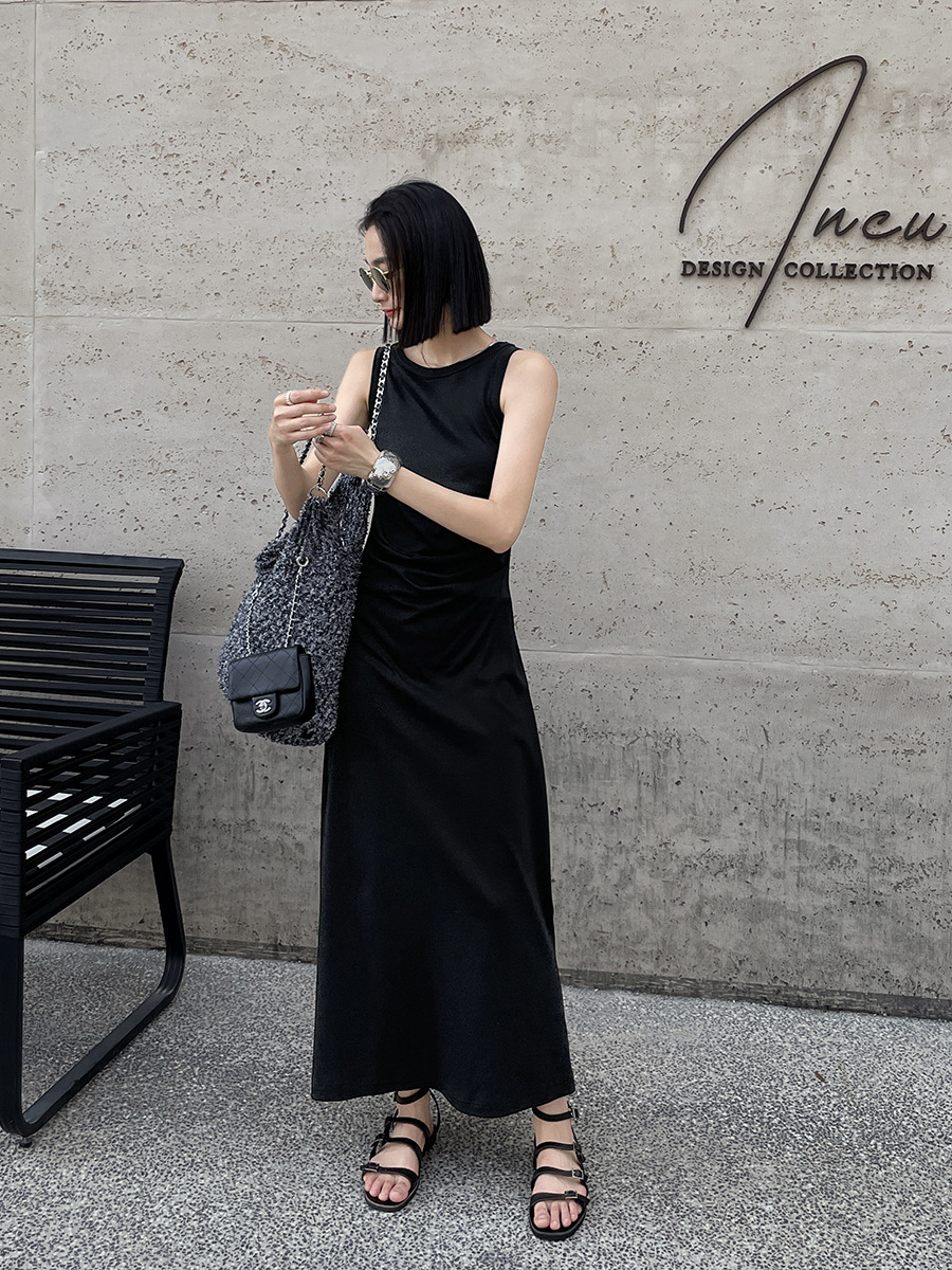 初打十三行春夏新款裙子设计感修身显瘦褶皱无袖长款连衣裙女