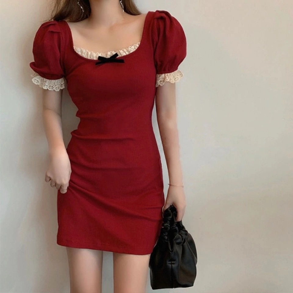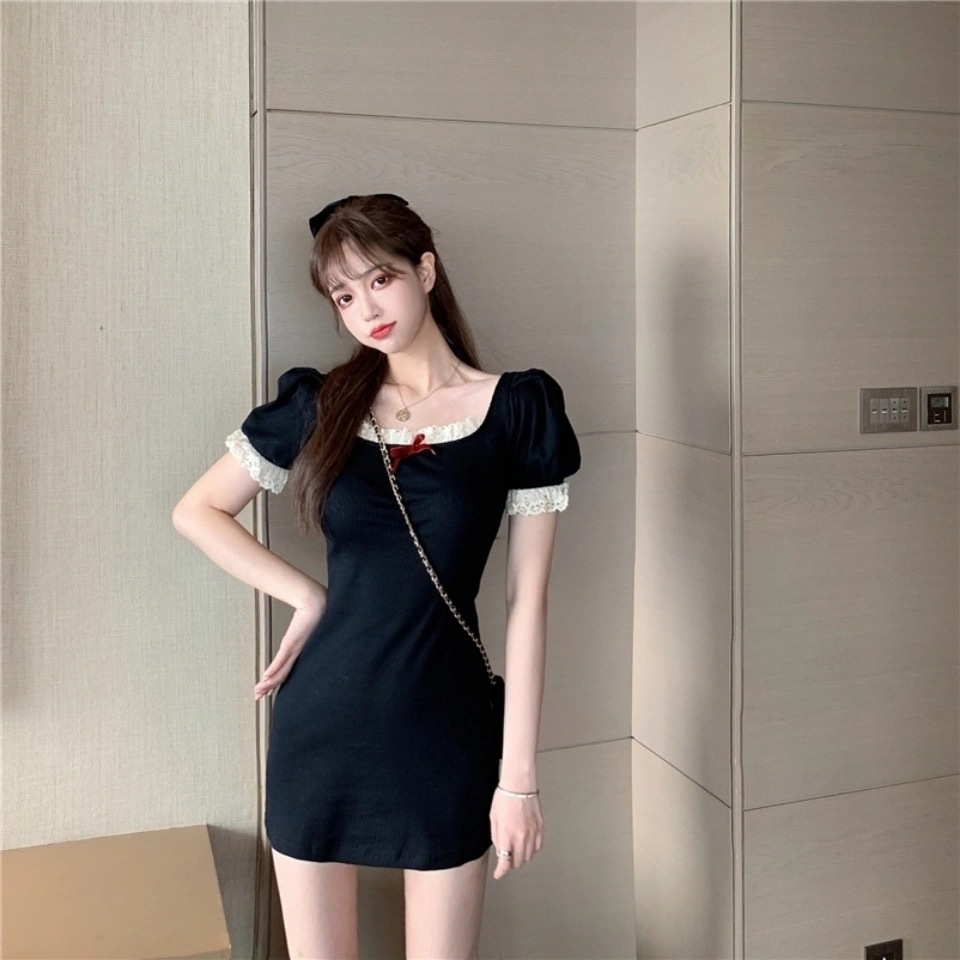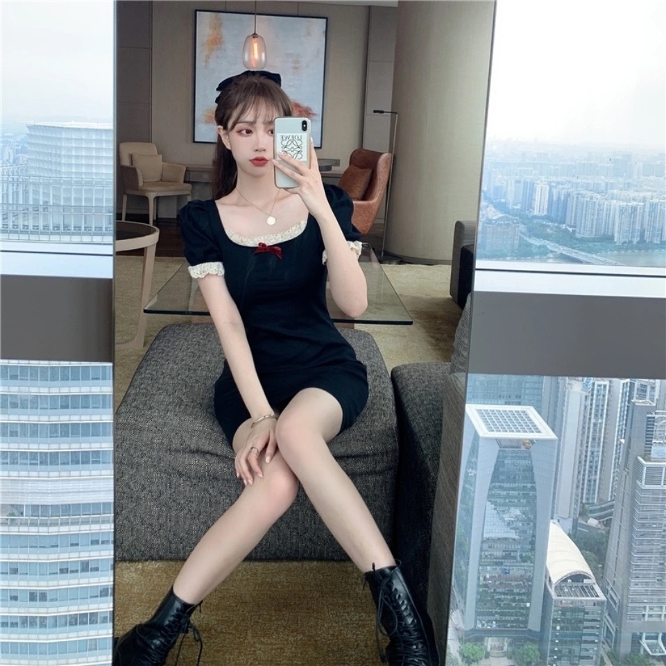 连衣裙女春夏新款方领法式复古设计感小众小个子气质修身裙子