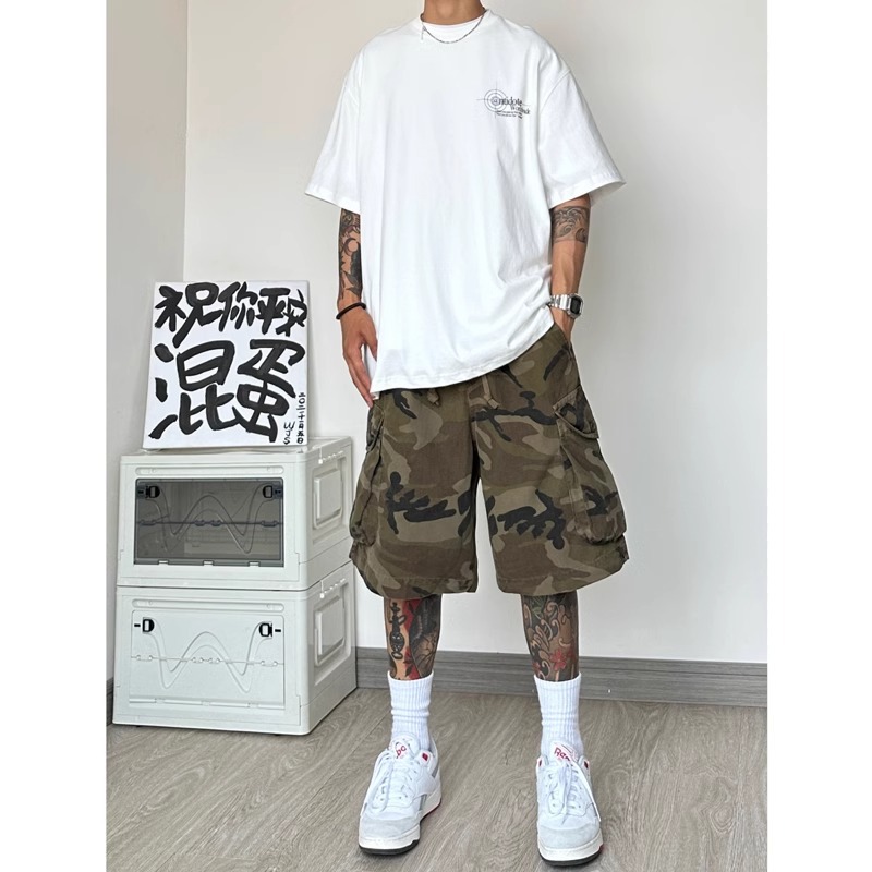 过膝迷彩工装短裤男夏季vibe美式宽松五分裤子设计感潮牌休闲中裤