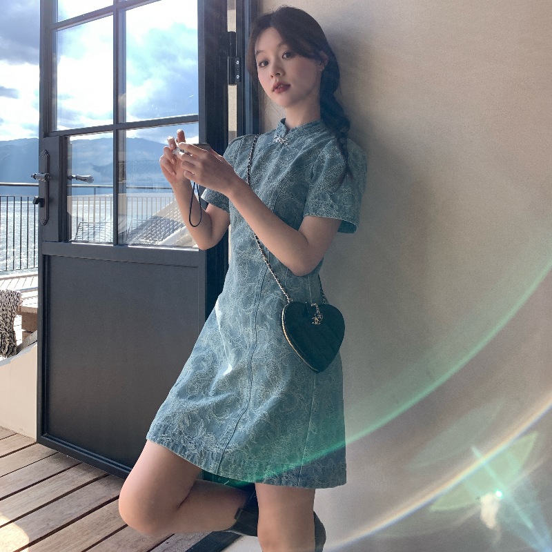 夏新中式复古立领盘扣压花牛仔连衣裙女