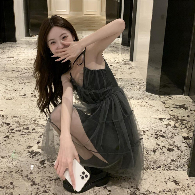 春夏黑色网纱领吊带连衣裙女夏装纯欲收腰蓬蓬短裙子
