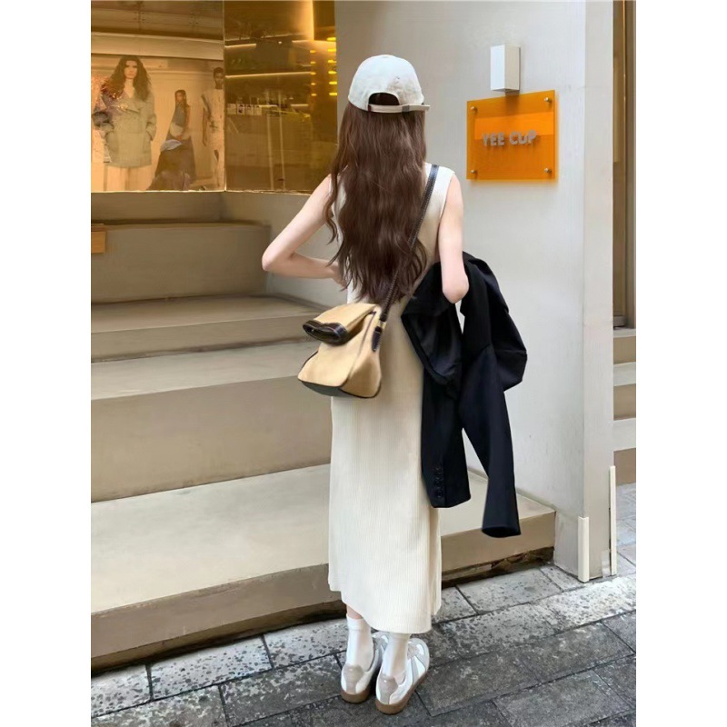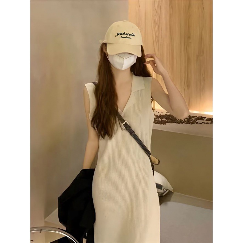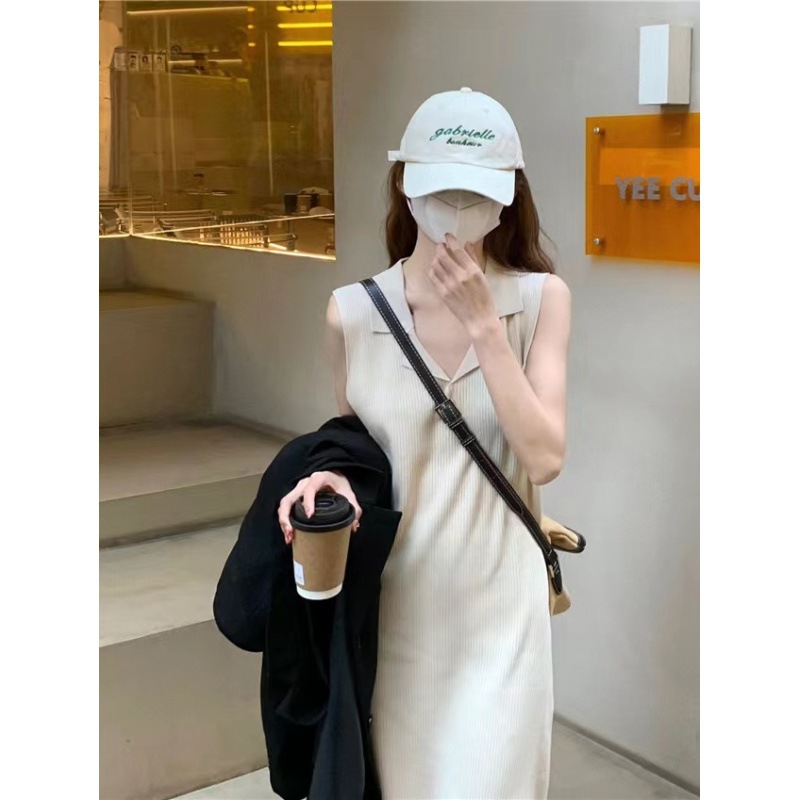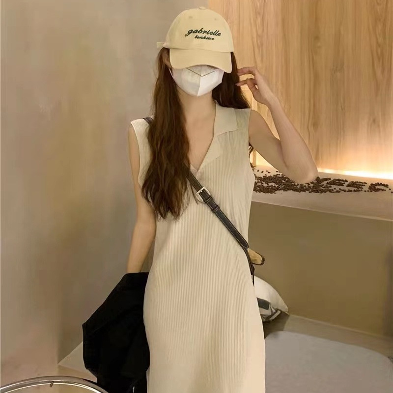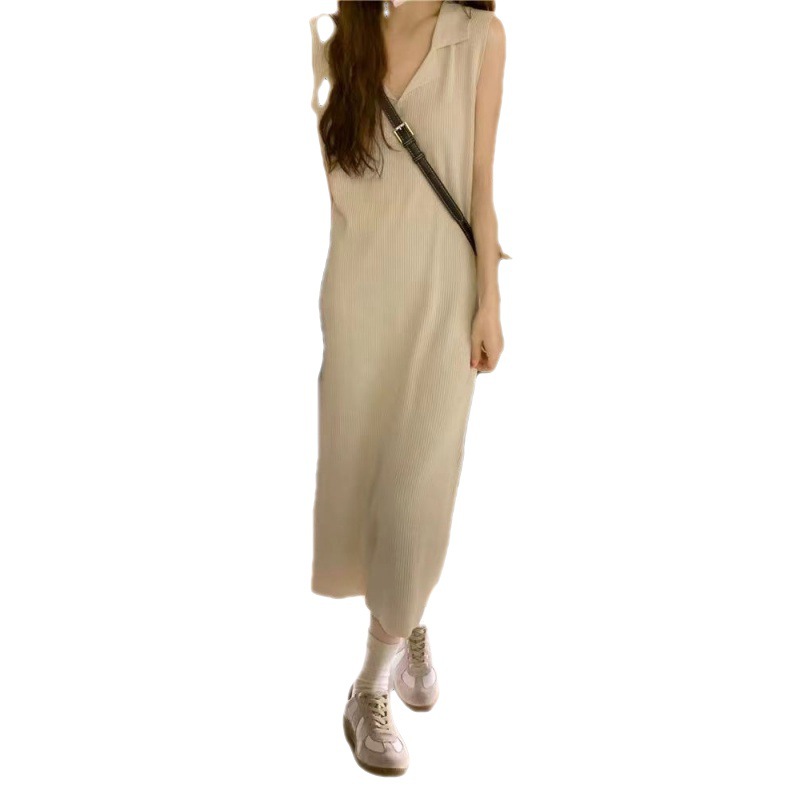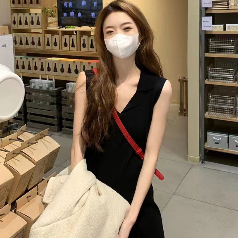 春夏新款温柔风韩版纯色无袖翻领背心连衣裙女简约外搭设计感长裙