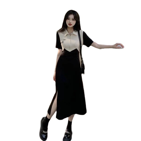 撞色设计感开叉连衣裙女春夏韩版新款POLO领收腰显瘦