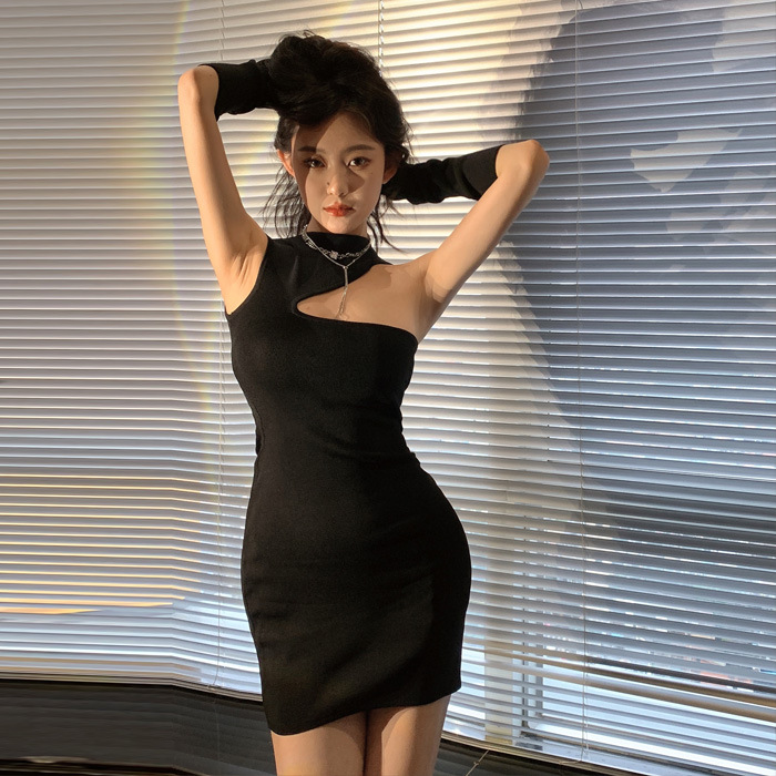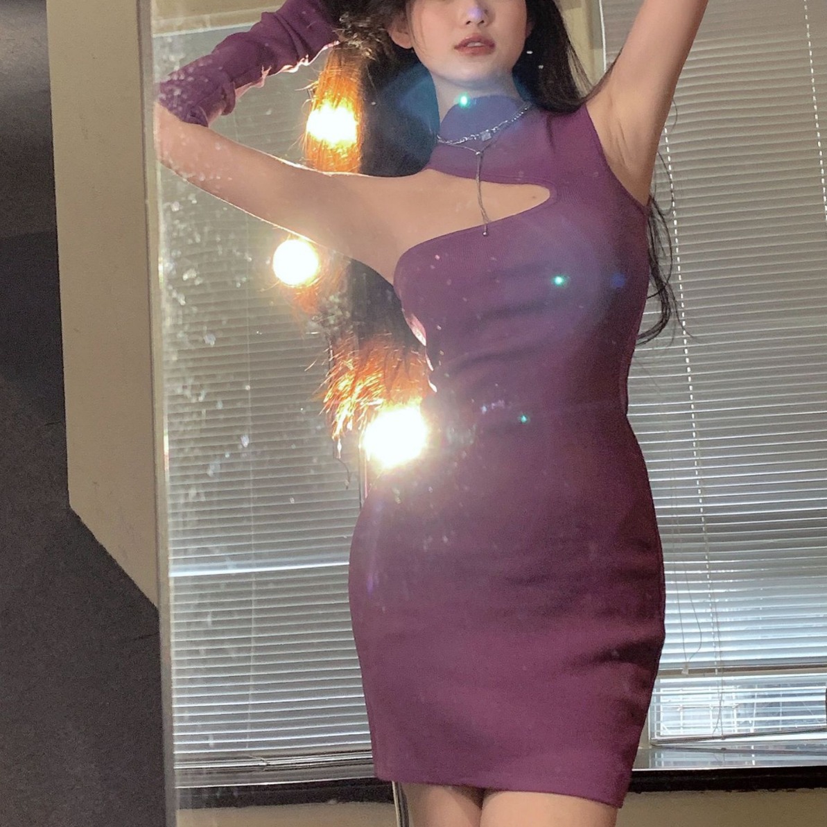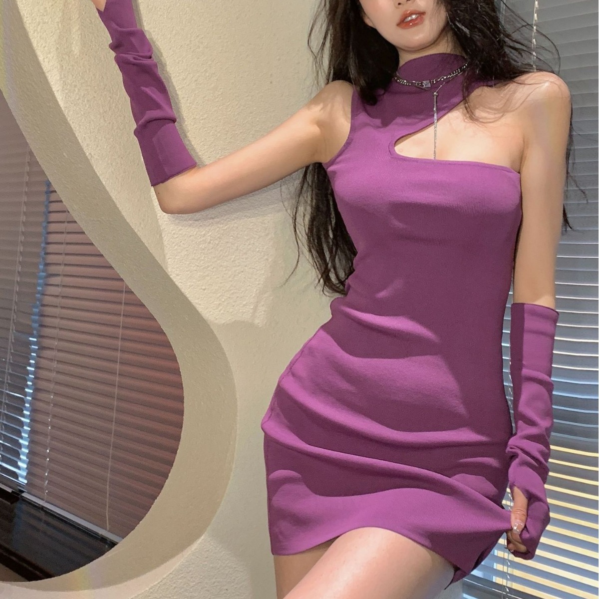 紫色性感辣妹镂空挂脖露肩高领袖套春夏新款修身包臀连衣裙女