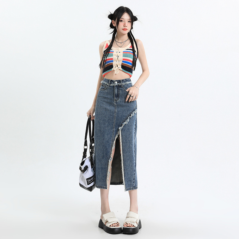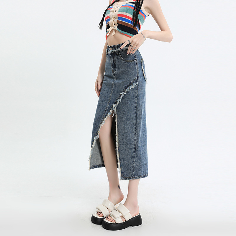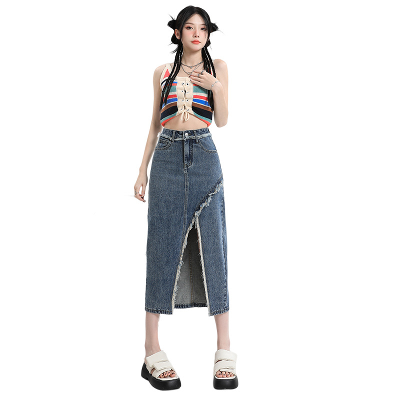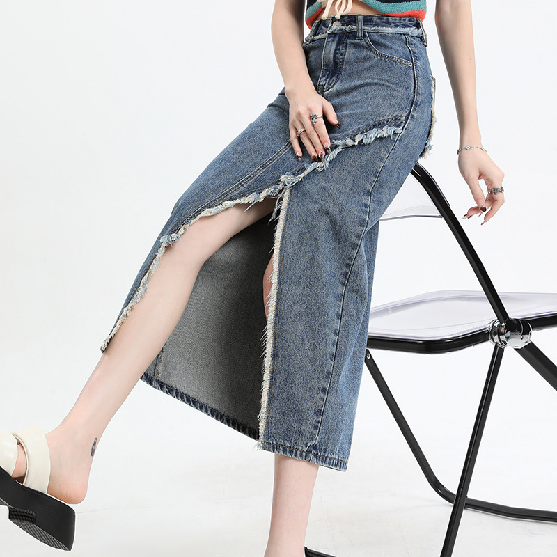 春夏新款高腰显瘦不规则开叉牛仔半身裙复古毛边设计感A字中长裙