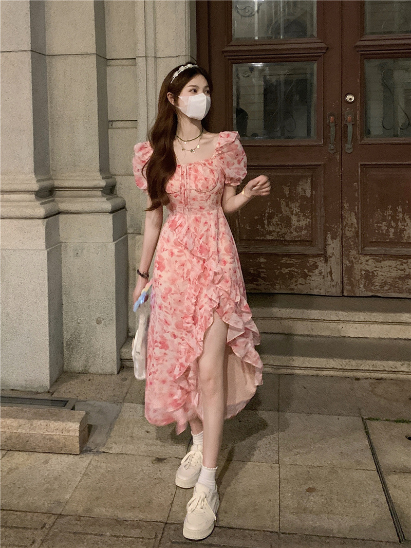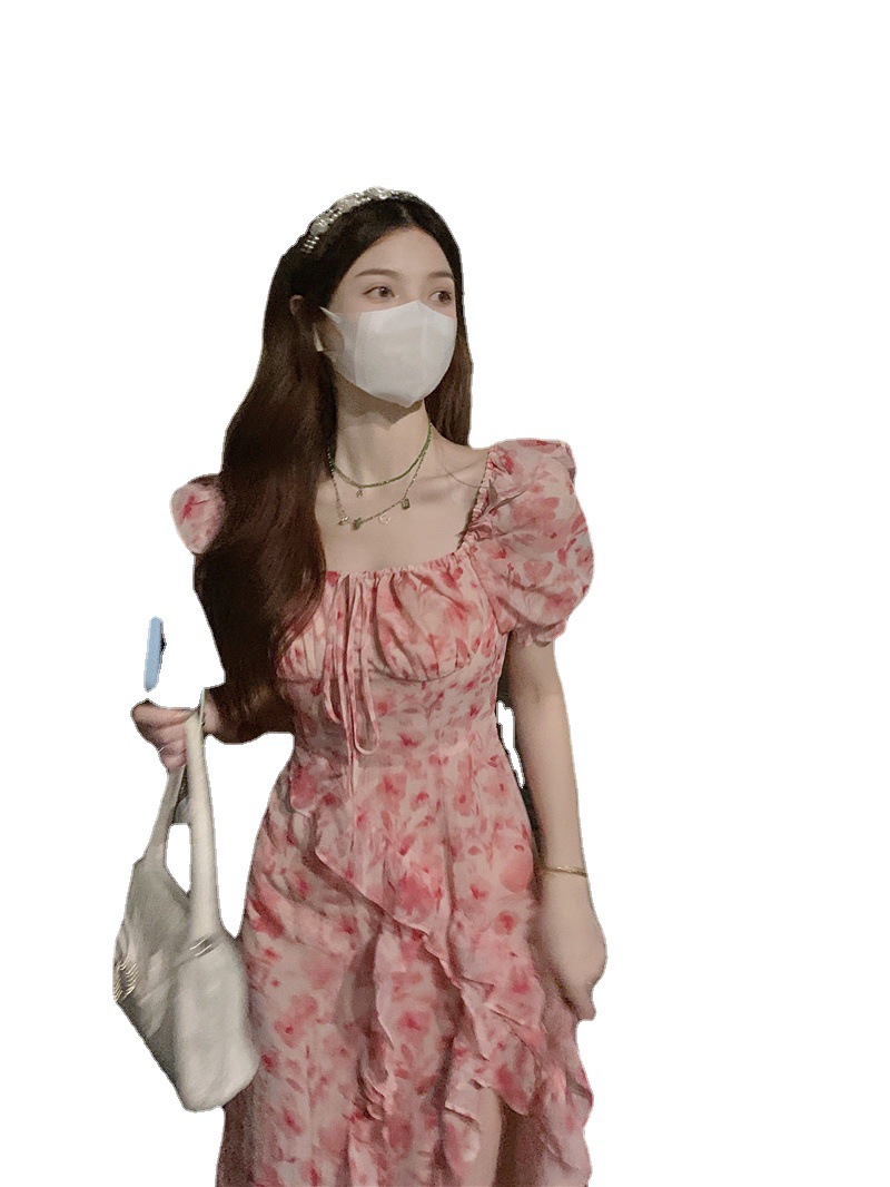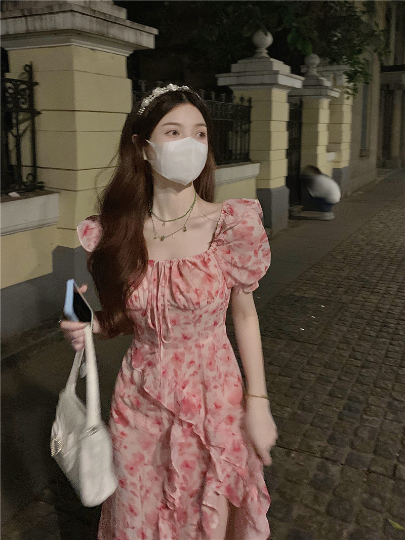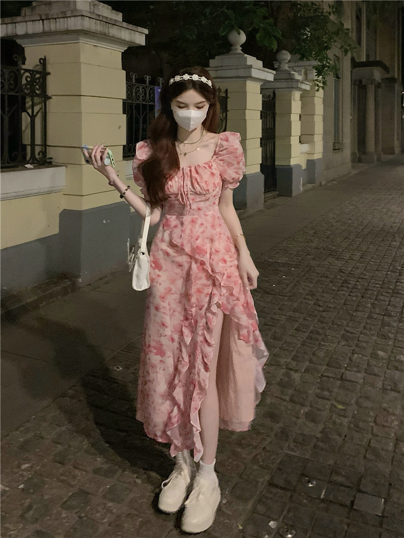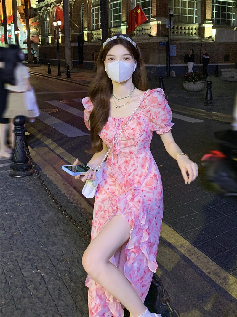 短袖碎花连衣裙女春夏新款设计感小众荷叶边开叉字裙子潮