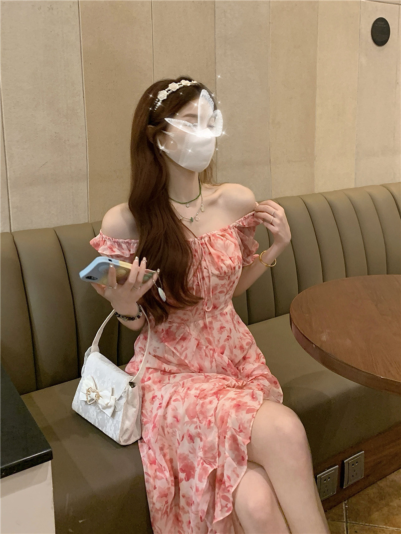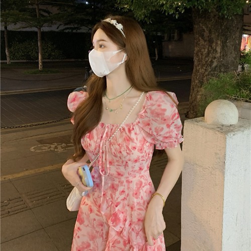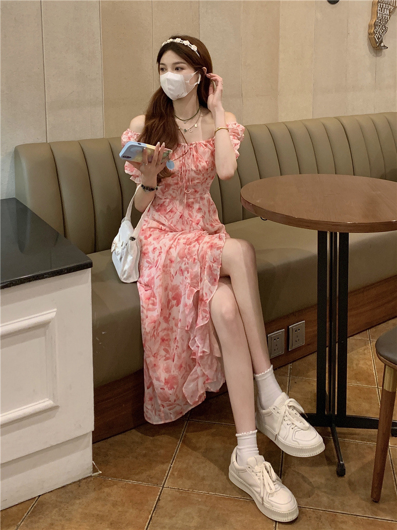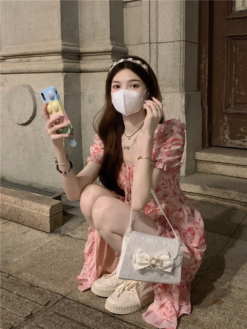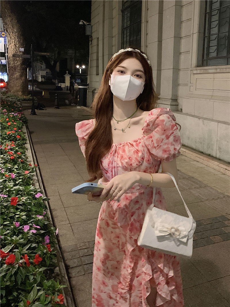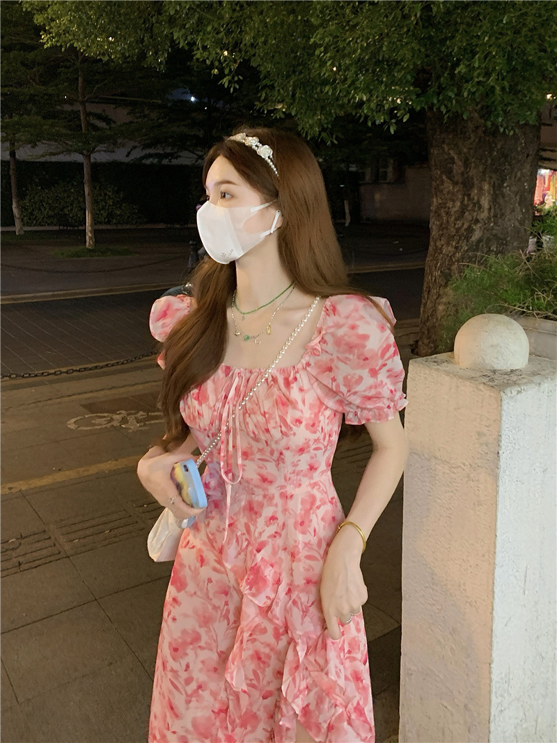 短袖碎花连衣裙女春夏新款设计感小众荷叶边开叉字裙子潮
