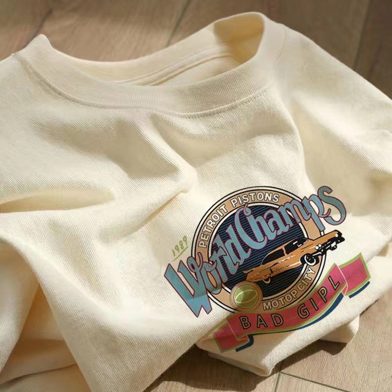 夏季新款杏色纯棉短袖T恤女宽松美式字母印花上衣ins情侣半袖