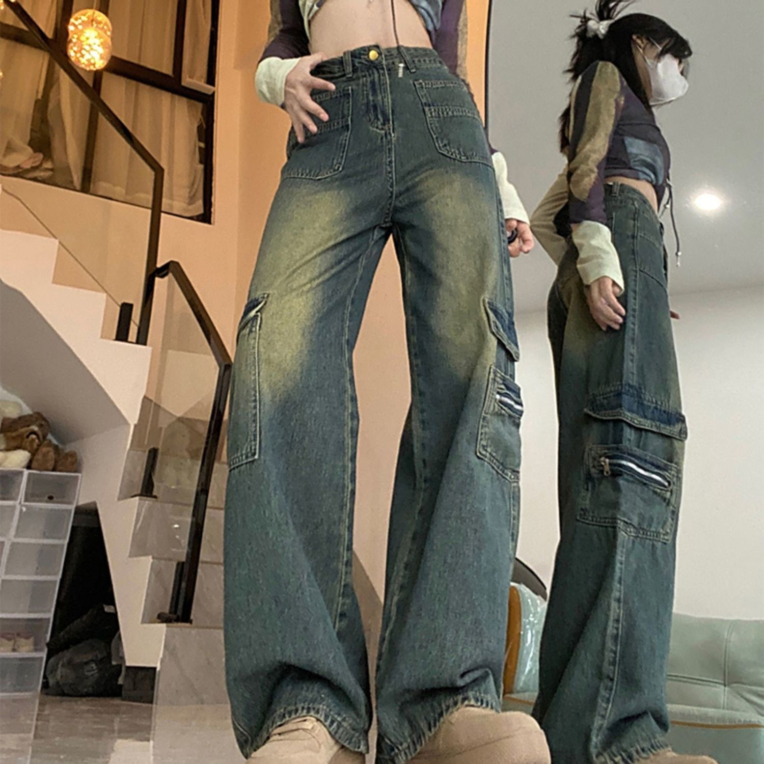 2025新款美式阔腿牛仔裤高街工装牛仔裤女宽松高腰直筒阔腿拖地裤