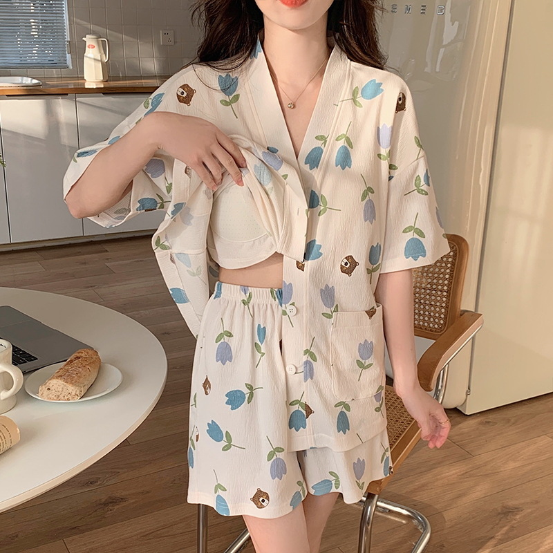 睡衣女夏日系甜美短裤短袖绉布棉带胸垫开衫夏天薄女士家居服套装