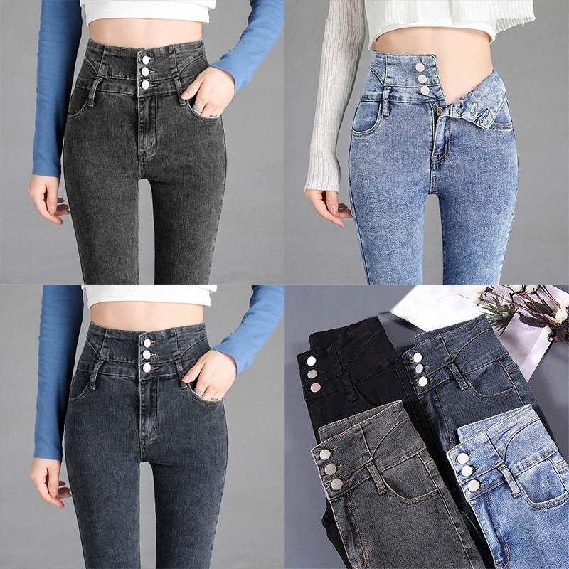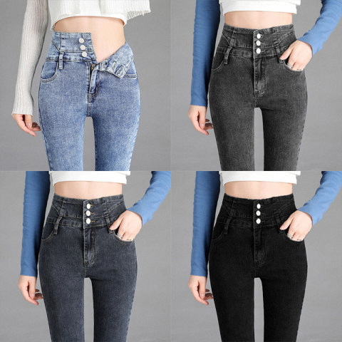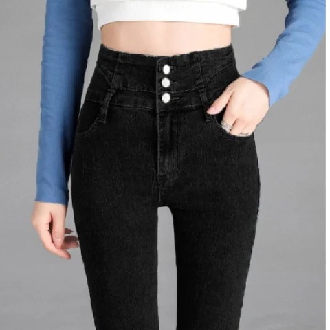 三粒扣高腰收腹小脚牛仔裤女秋冬新款修身弹力紧身高腰九分铅笔裤
