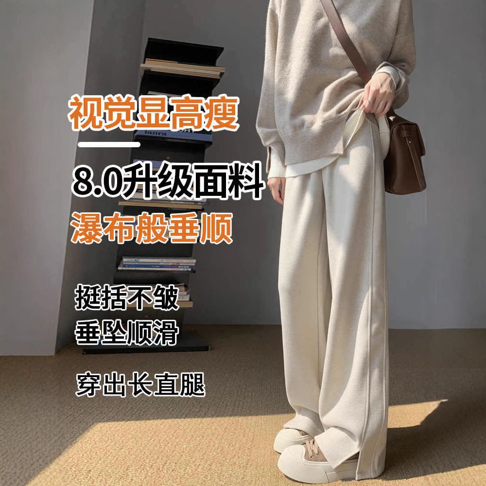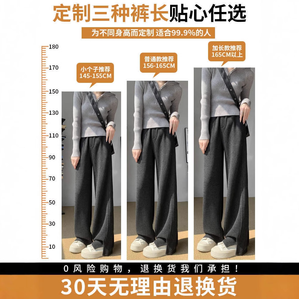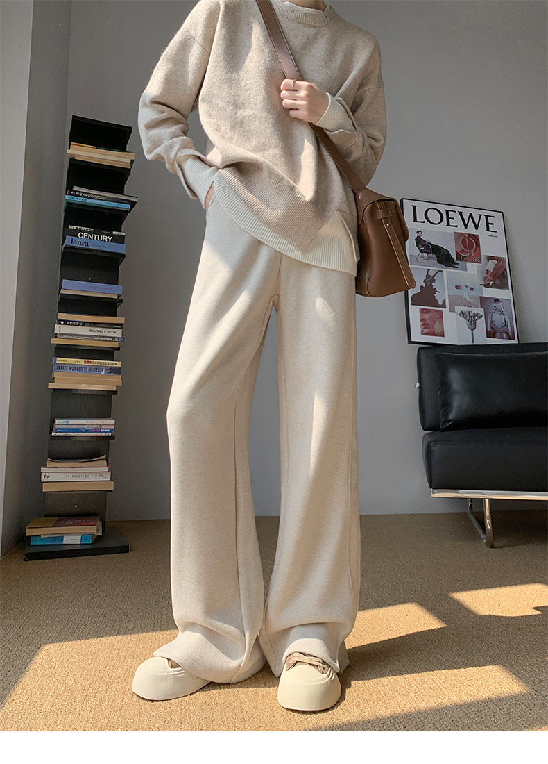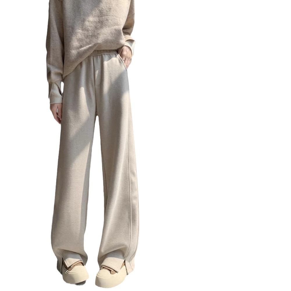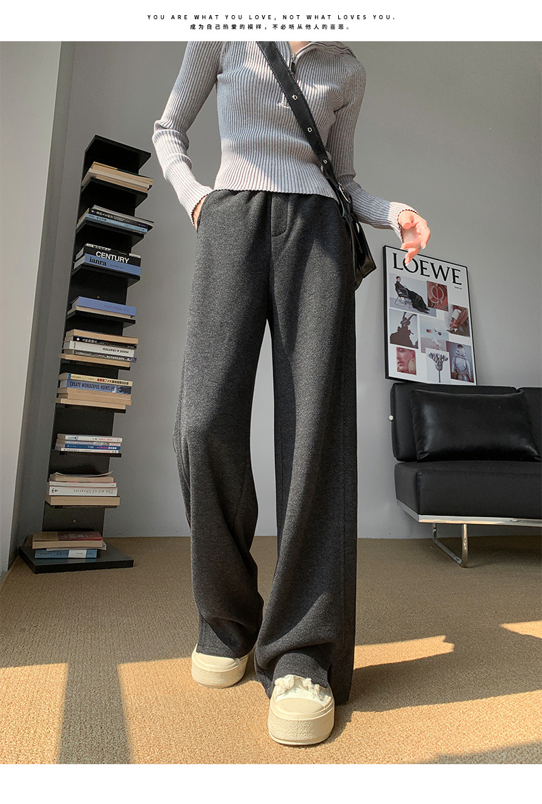人字纹加绒阔腿裤女春秋冬窄版直筒开叉毛呢裤加厚仿羊毛针织裤子