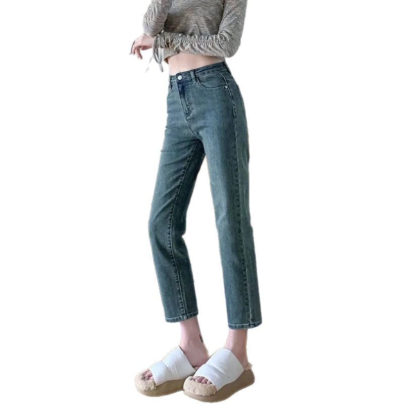 设计感绿标小牛仔直筒裤女时尚梨形身材修身复古弹力九分休闲裤子