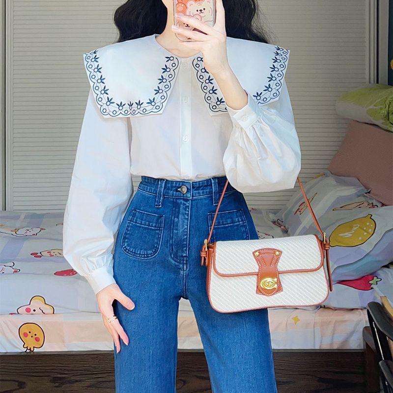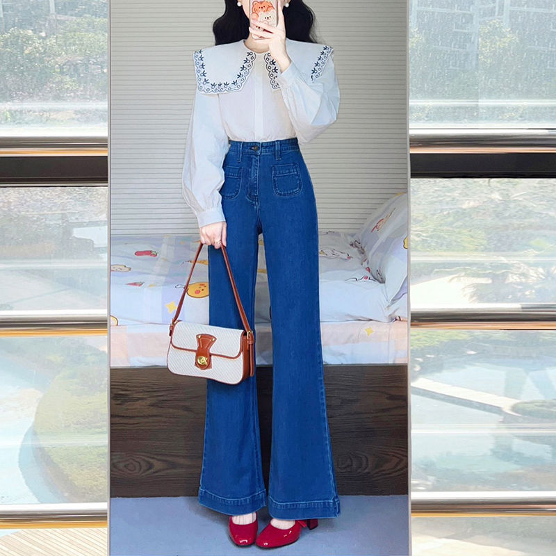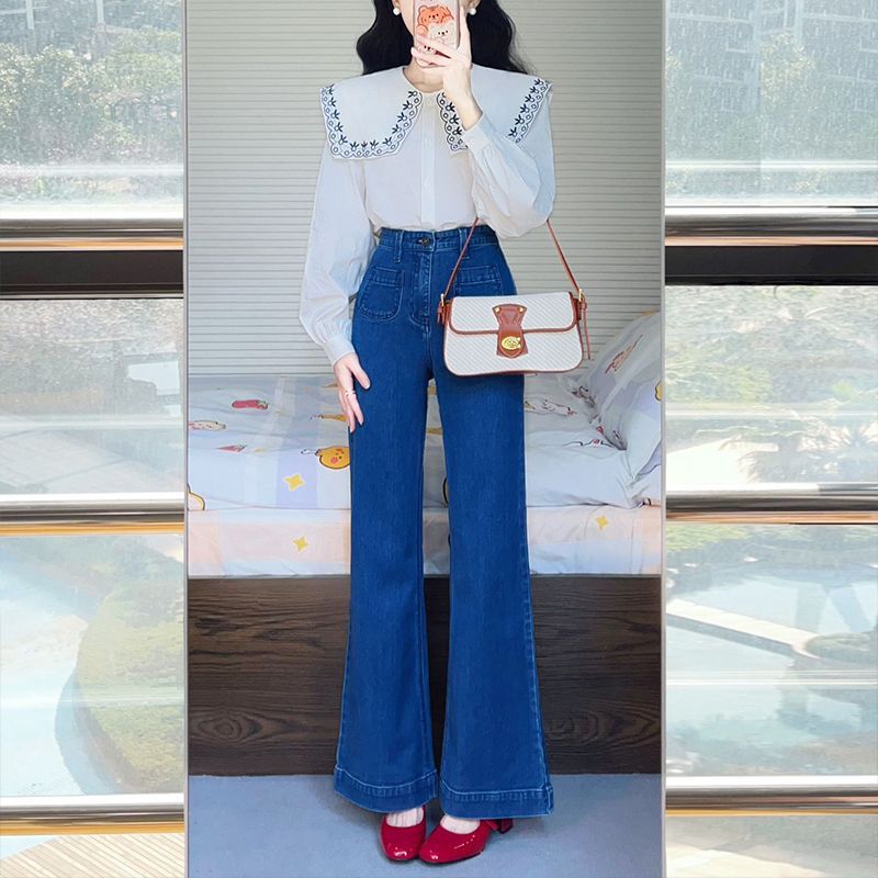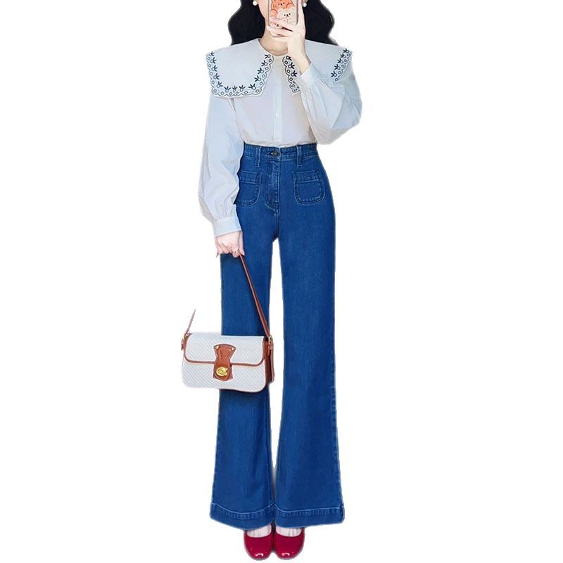 复古高腰百搭微喇水洗牛仔裤女ins港风小众显瘦韩版阔腿长裤潮流