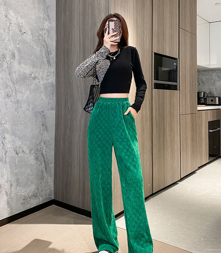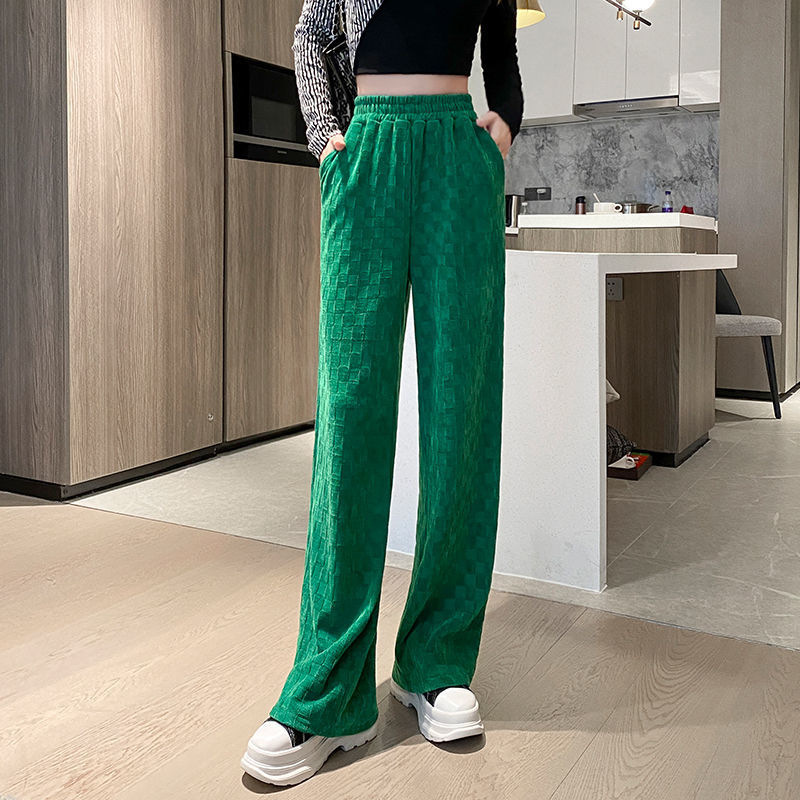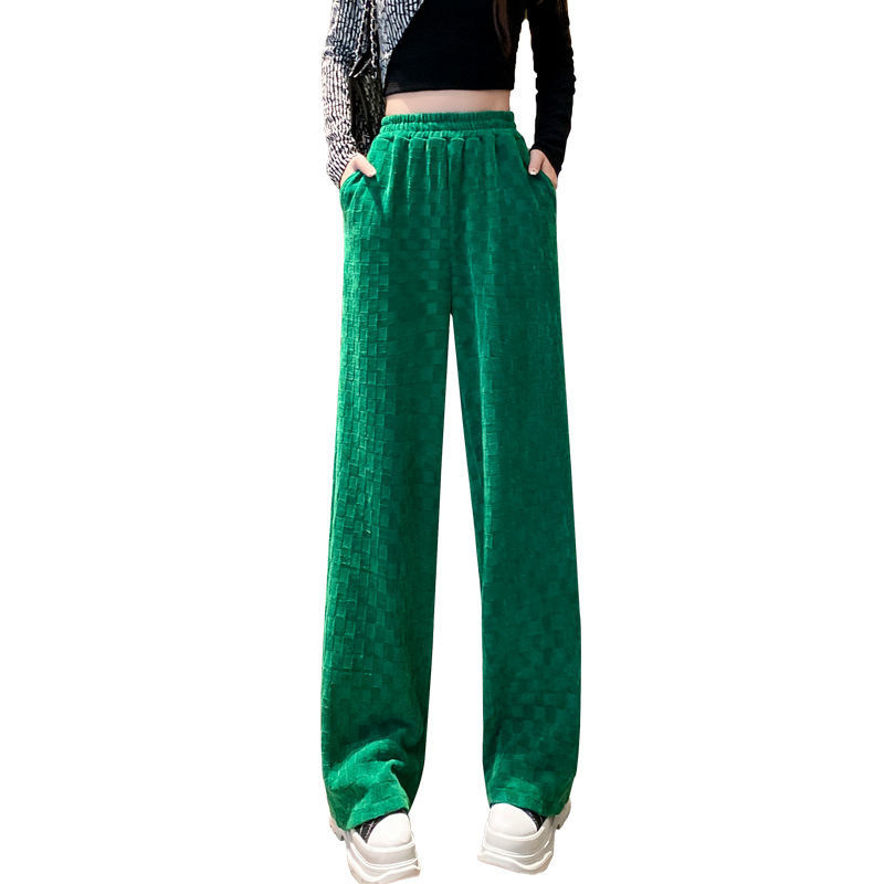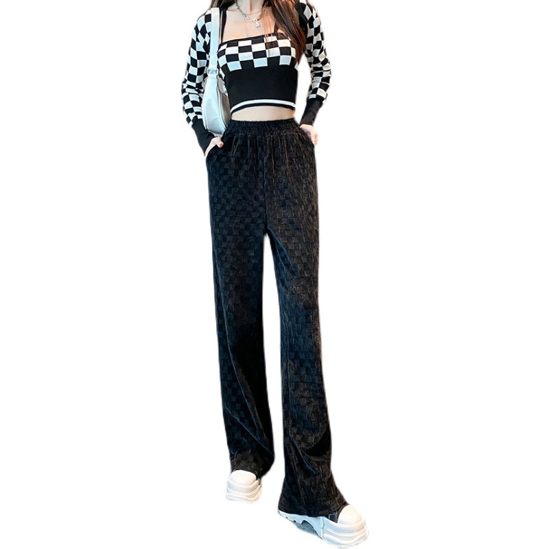 美式复古潮提花格子丝绒阔腿裤女秋装高腰长裤宽松休闲直筒拖地裤