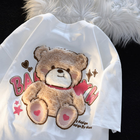 可爱奶凶立体卡通毛绒小熊刺绣短袖T恤女夏季新款个性百搭上衣潮