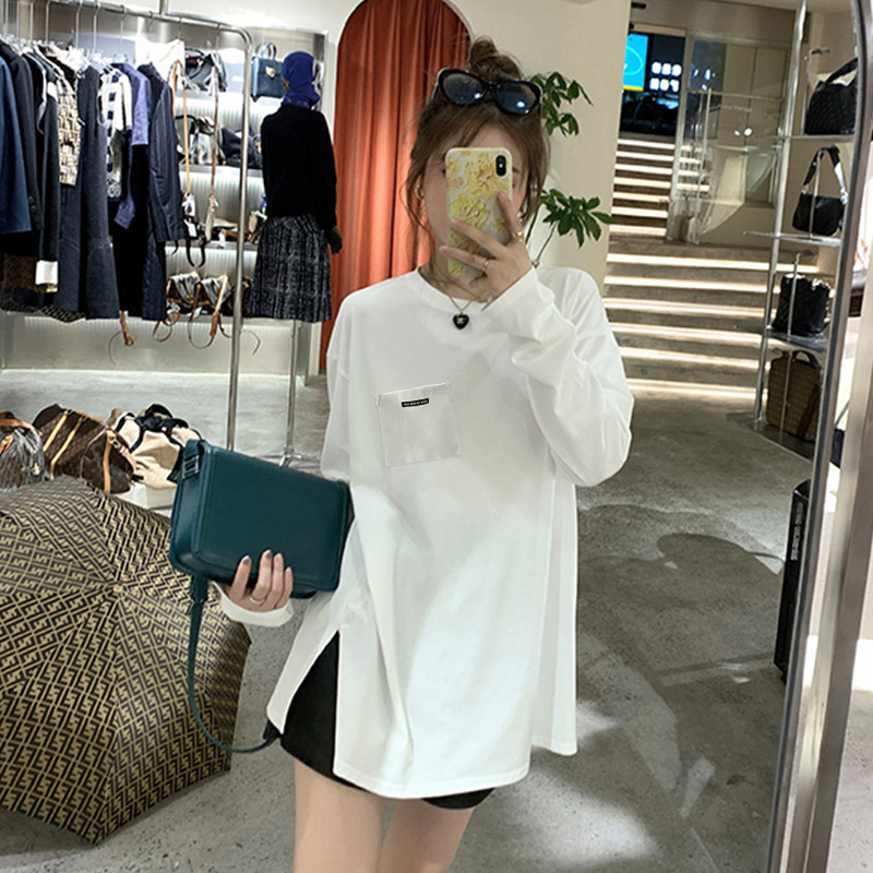 纯棉长袖T恤女春秋季2025年新款开叉慵懒风上衣宽松休闲打底衫
