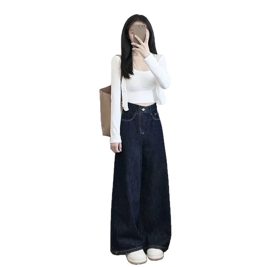 美式复古高腰深色宽松阔腿牛仔裤女2025春秋新款垂感直筒裤子