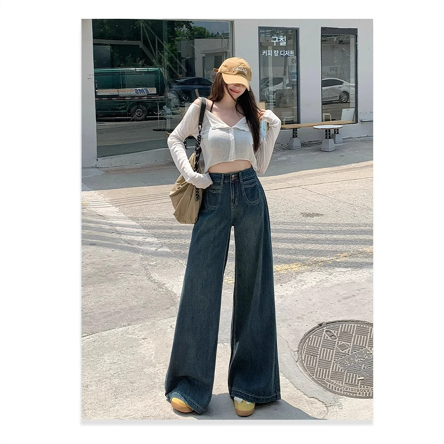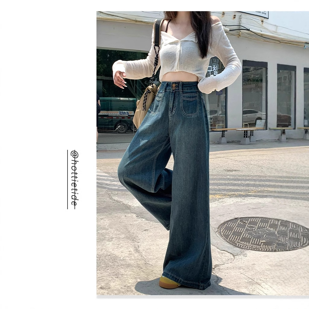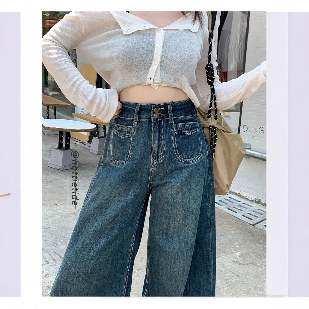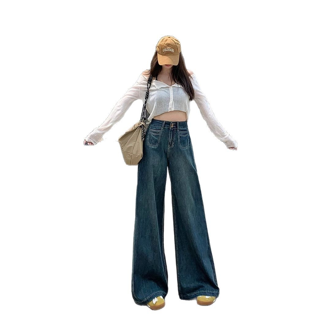 美式复古深蓝色宽松阔腿牛仔裤女春秋季高腰垂感慵懒松弛感直筒裤