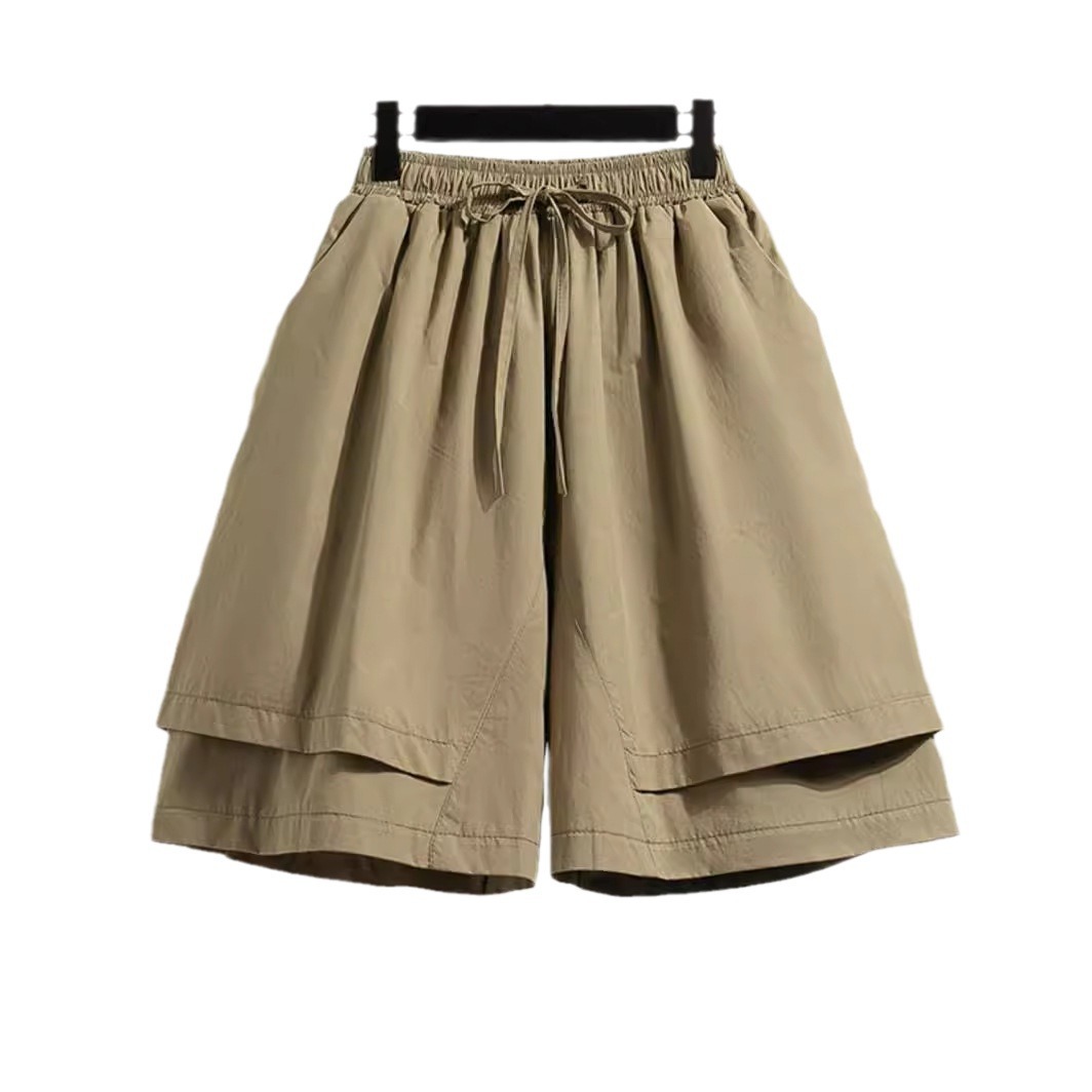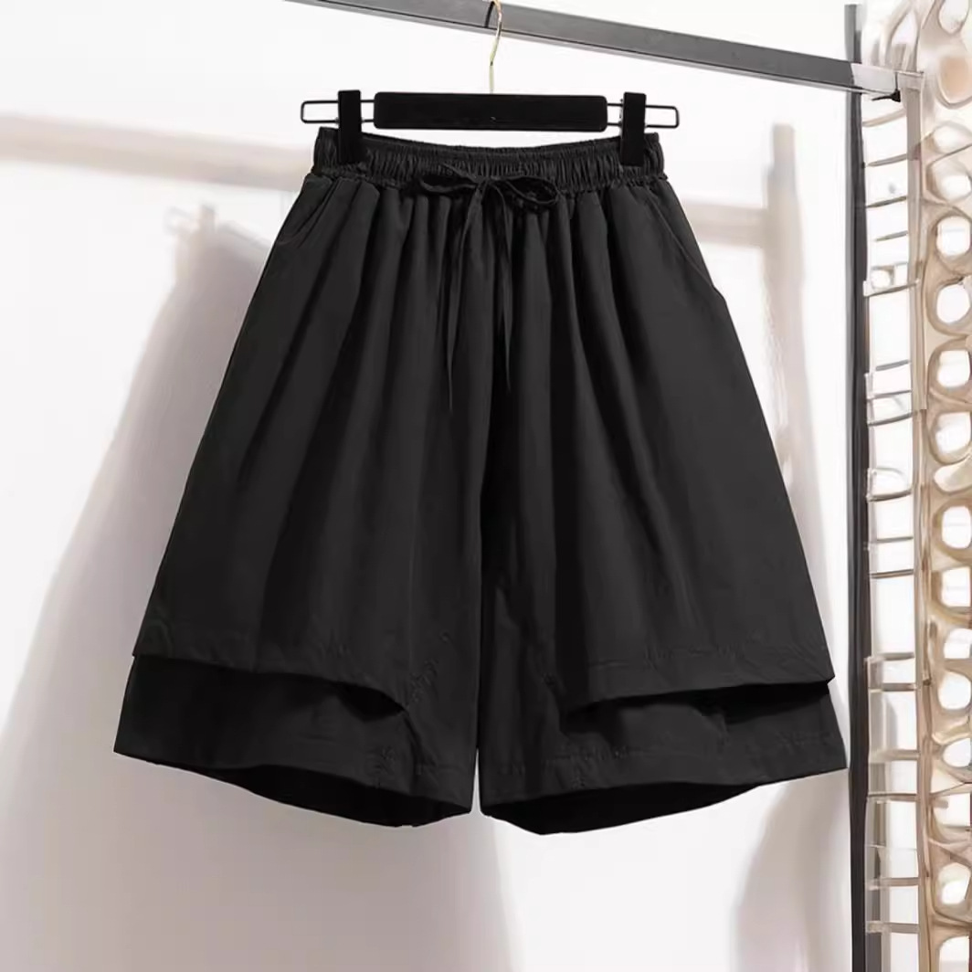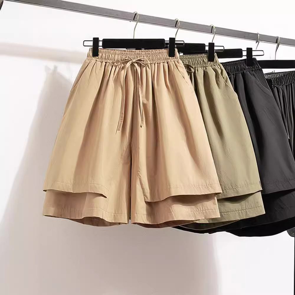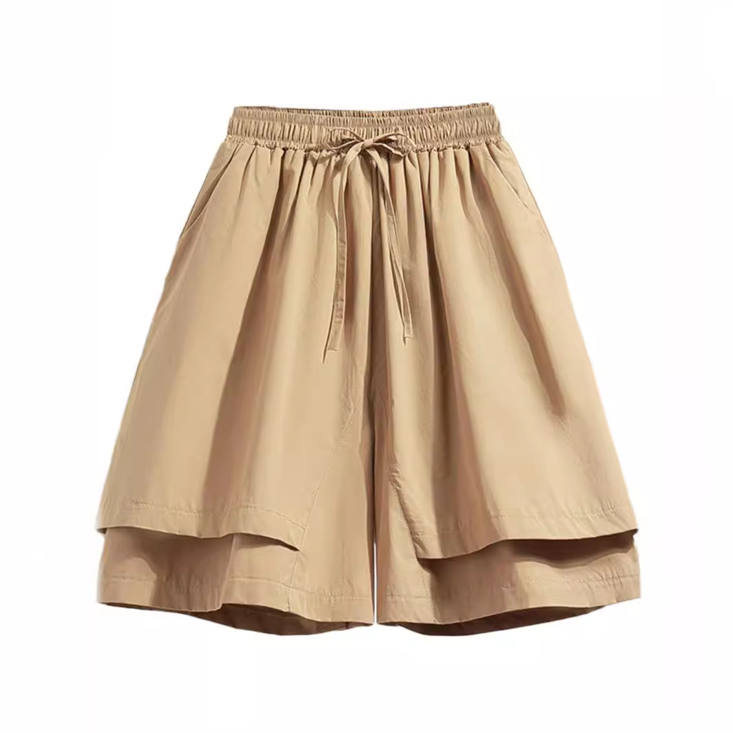 裤裙新款夏季休闲松紧腰系带显瘦遮肉假两件阔腿裤纯色五分短裤女