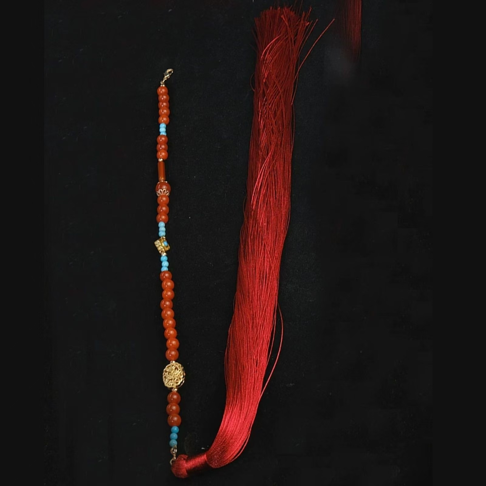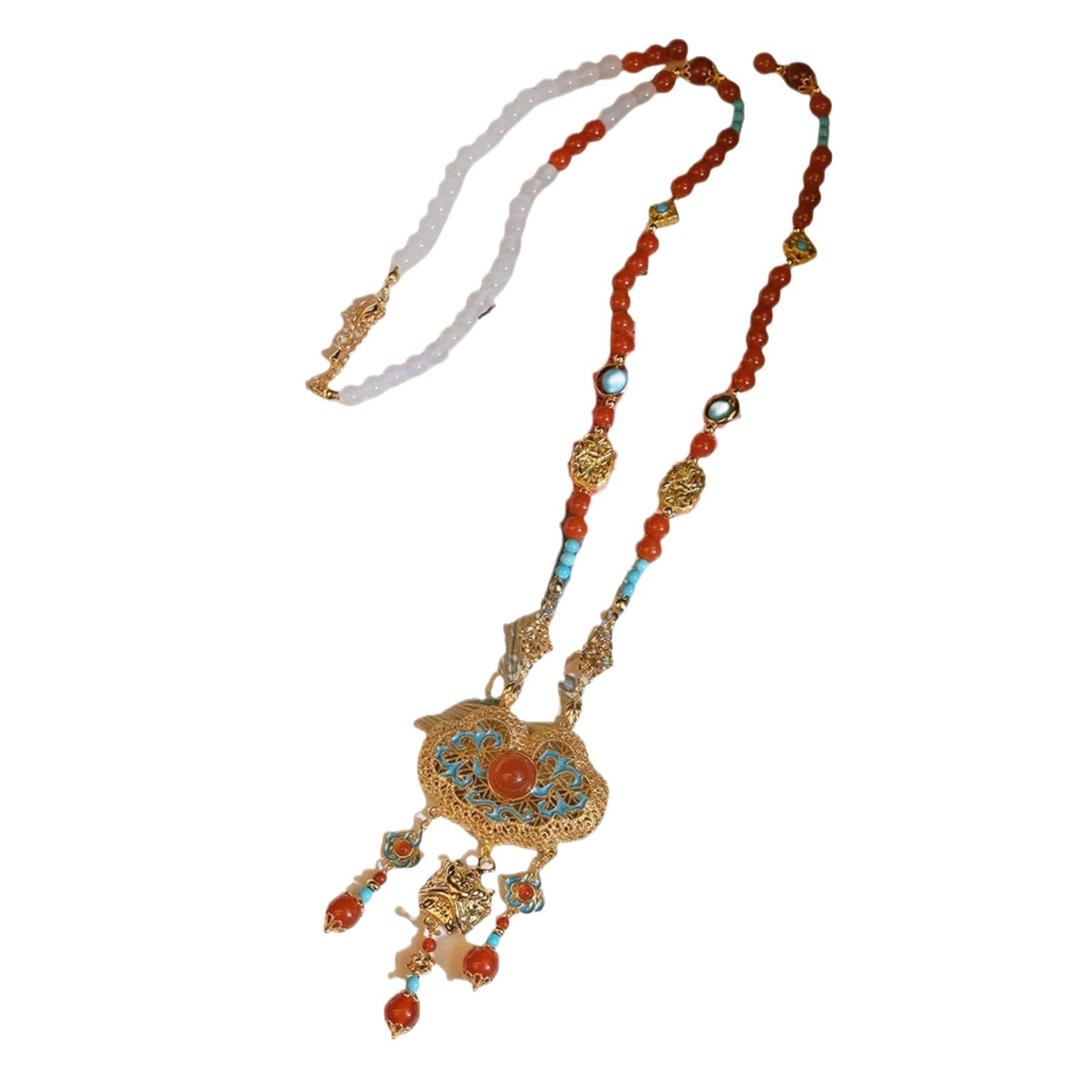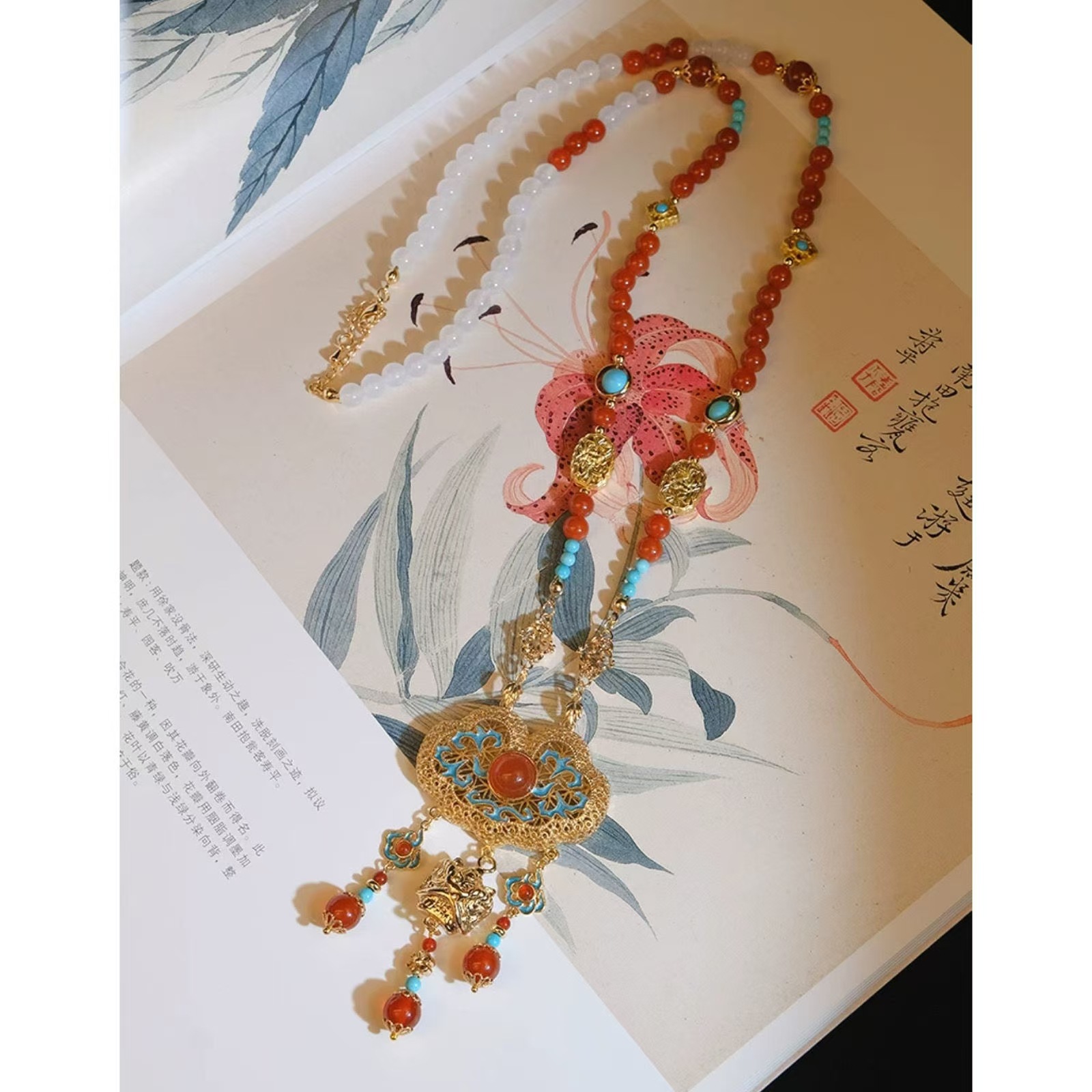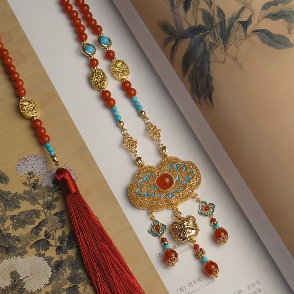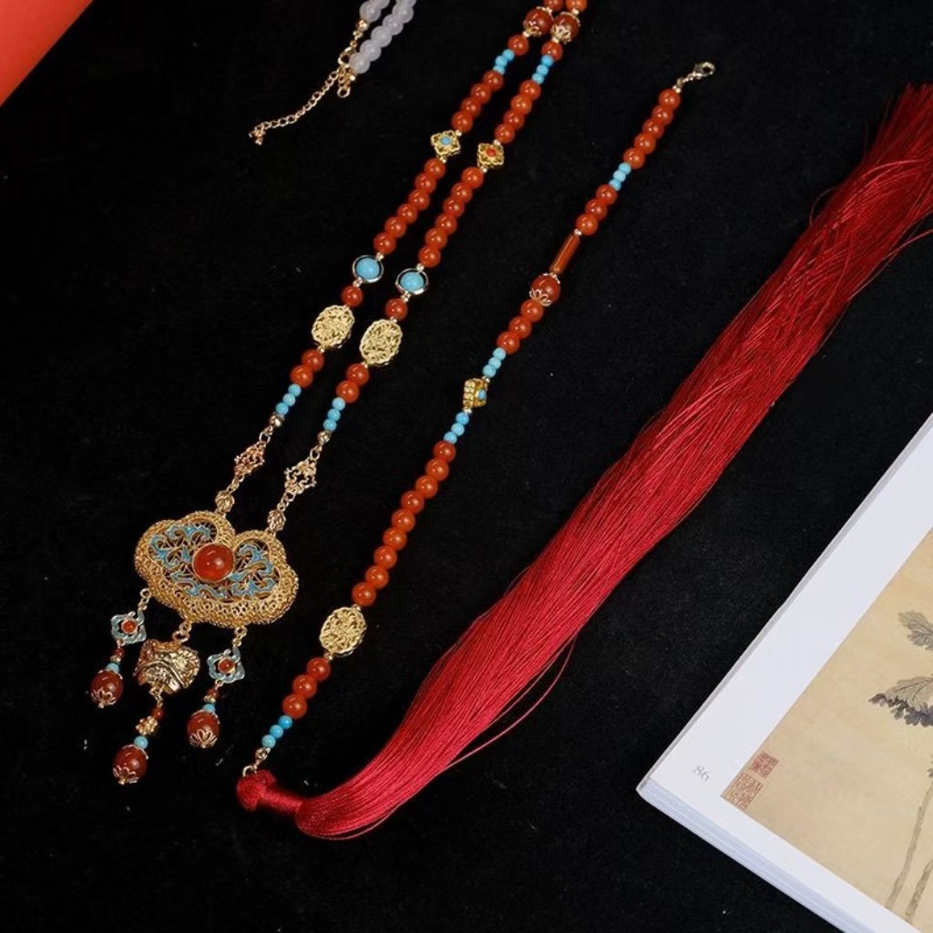 花屿集红玉石仿点翠平安锁大红色新年汉服长璎珞流苏背云古风项链