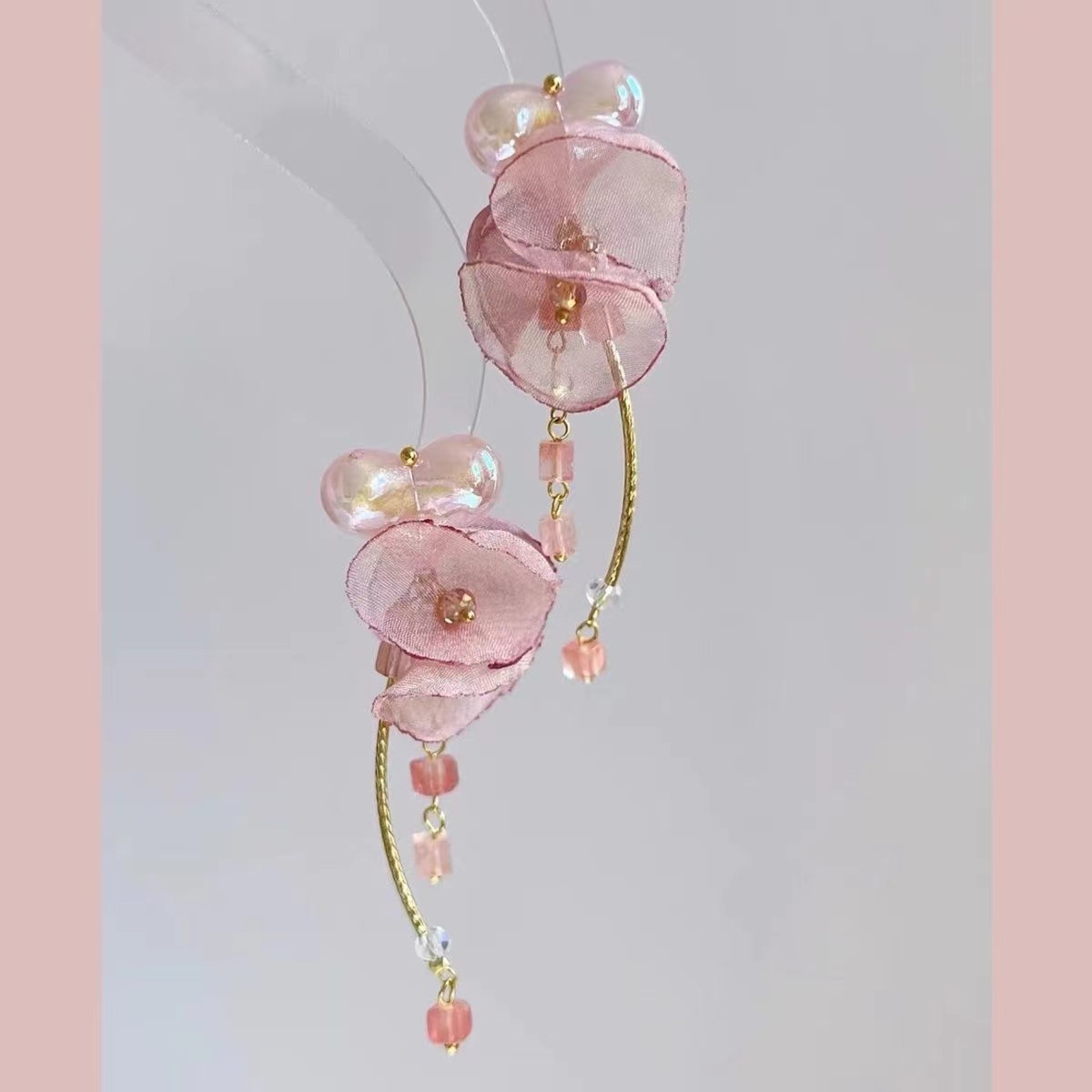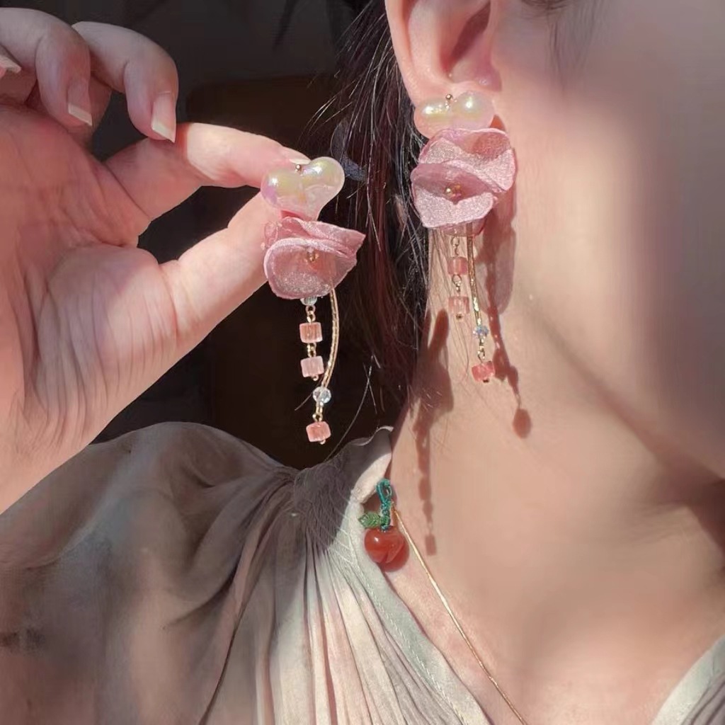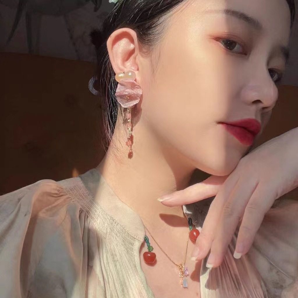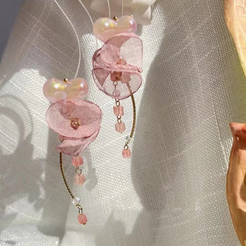 杏桃甜酒原创春夏甜美温柔粉色网纱花朵耳夹无耳洞水晶爱心耳环女