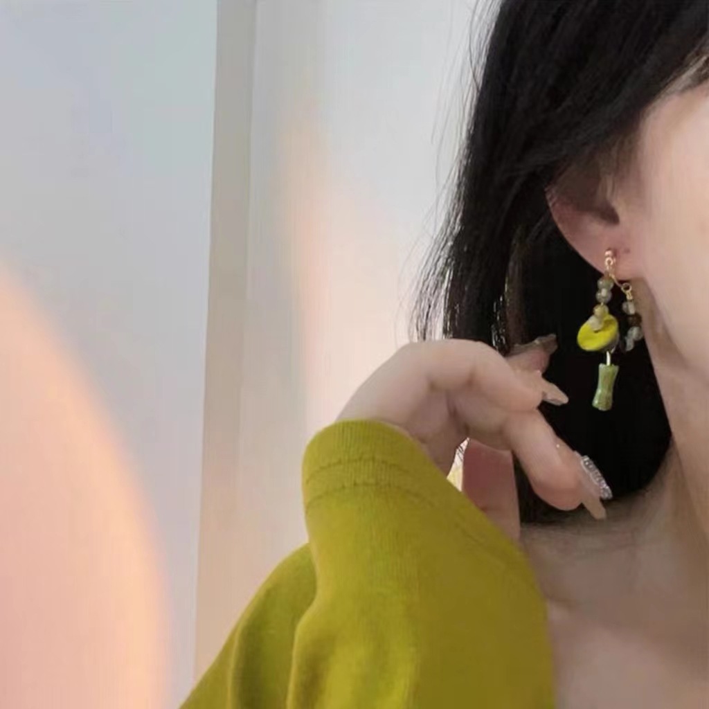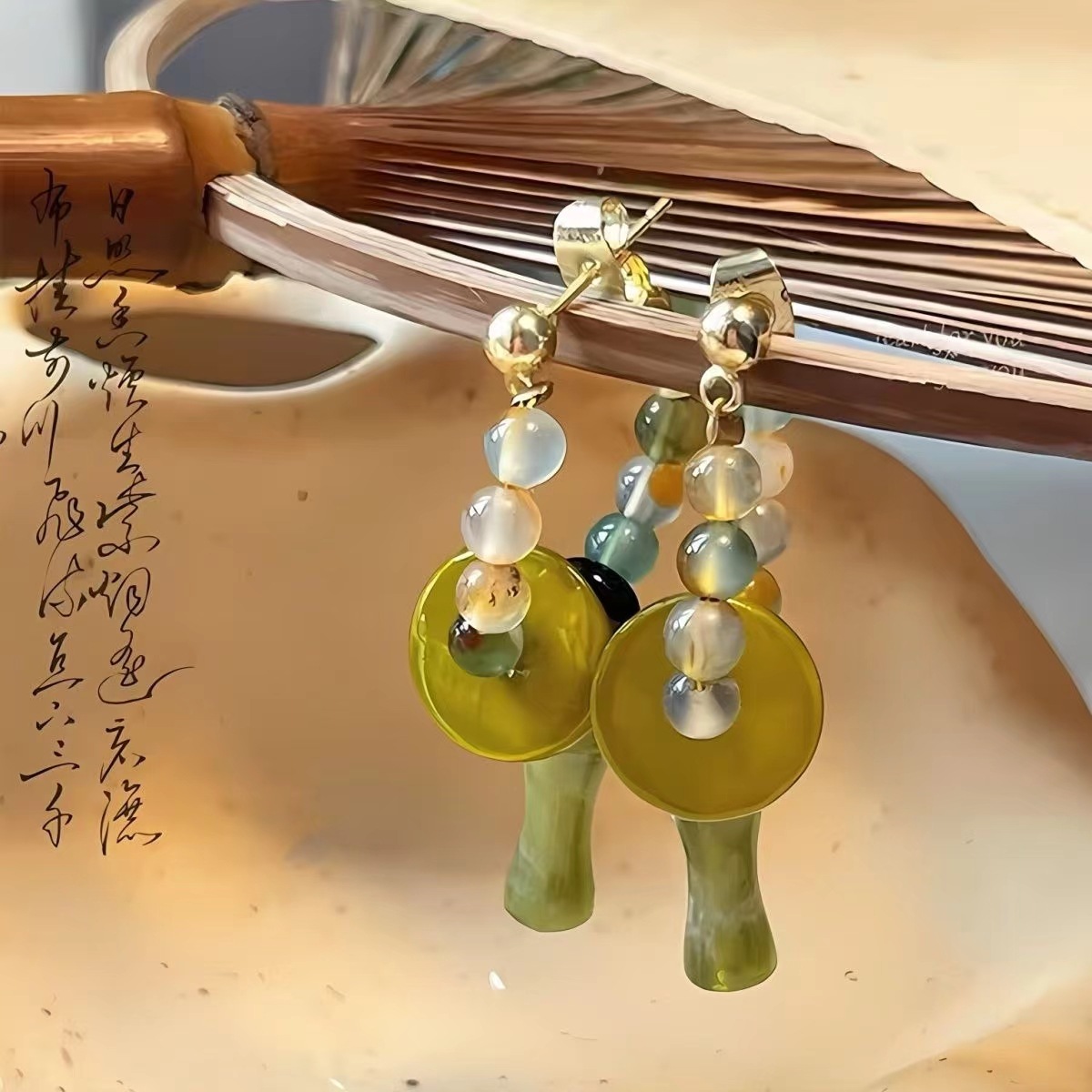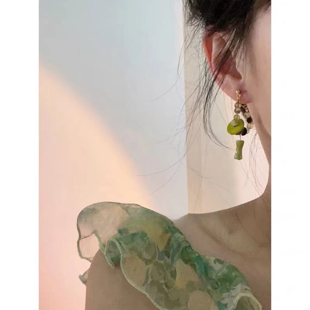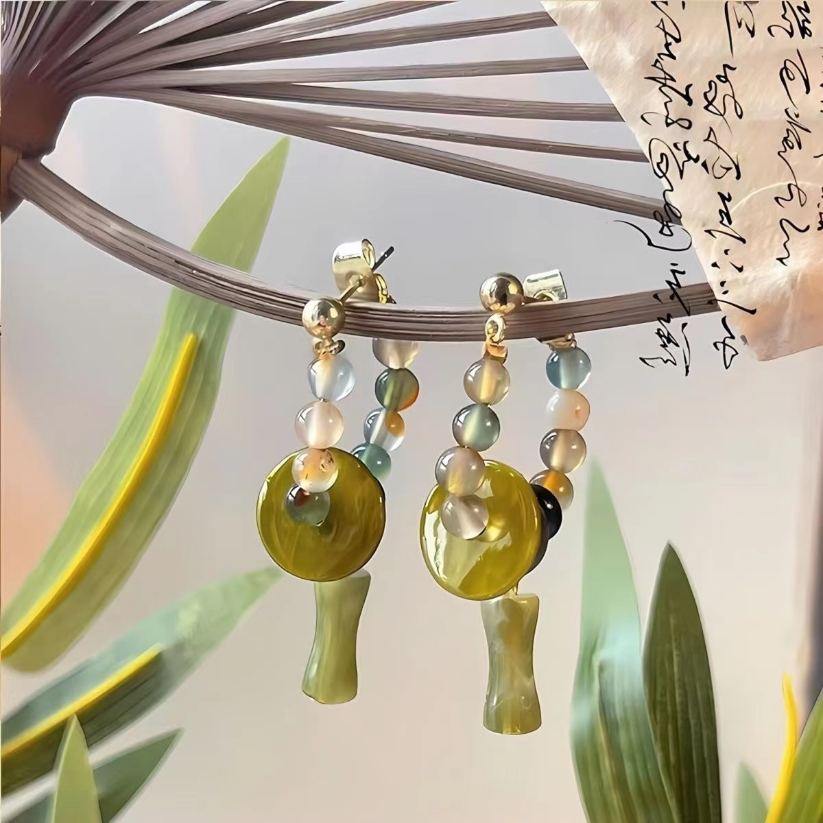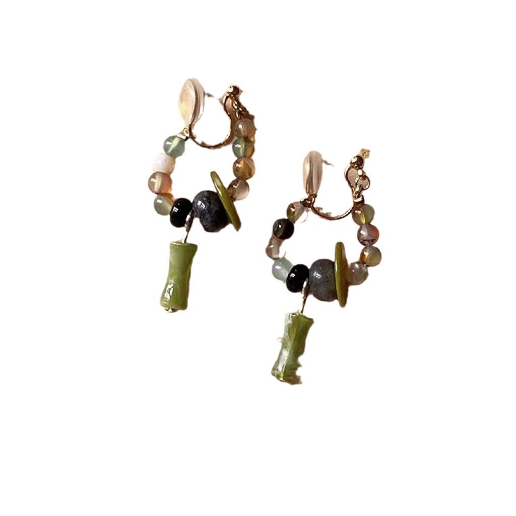 春夏天然石串珠古风竹节撞色耳圈环名族风复古蚊香盘耳夹无耳洞女