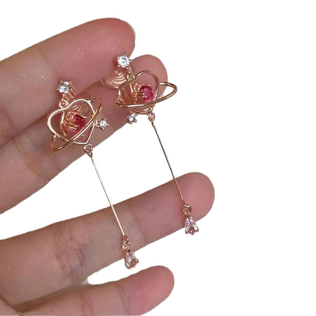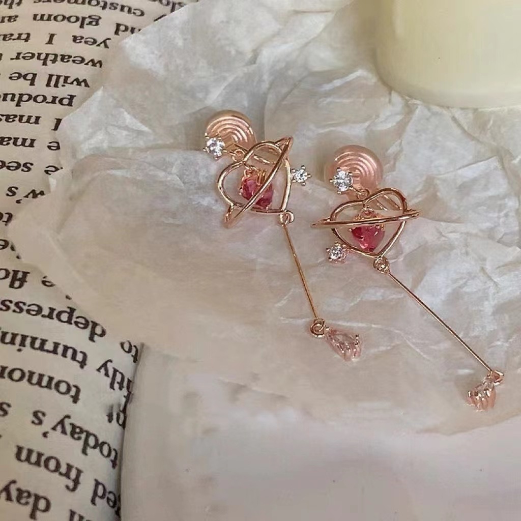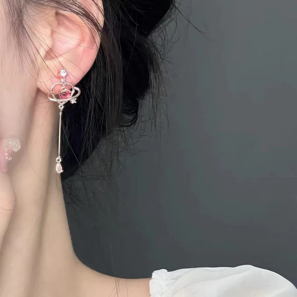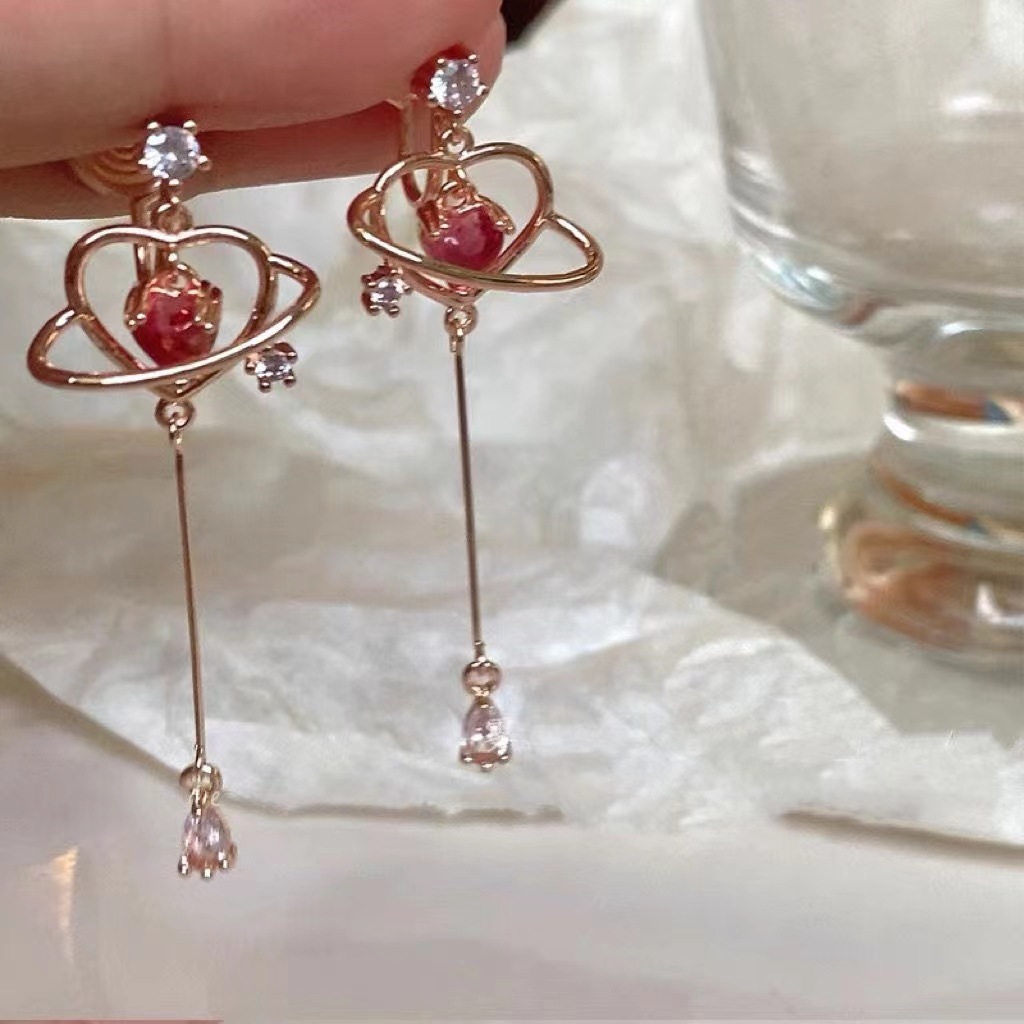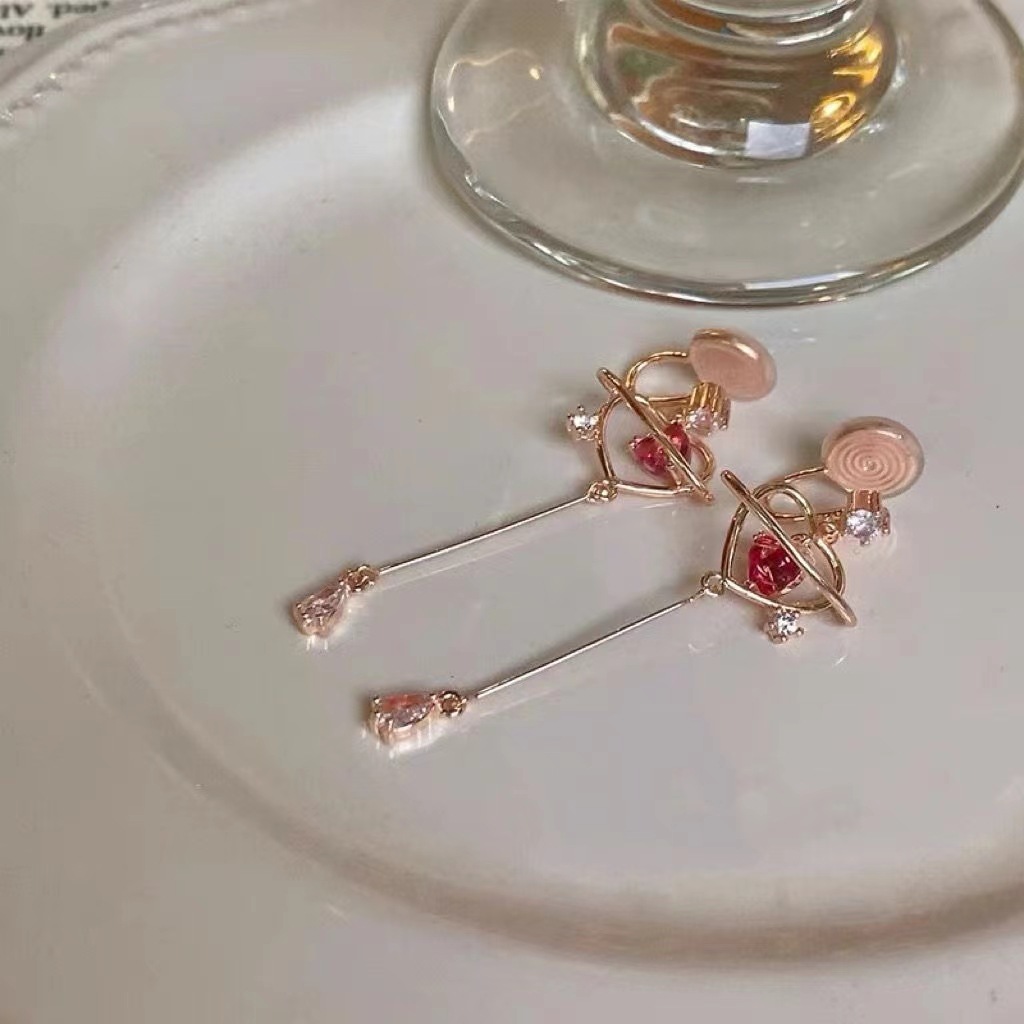 沙漠玫瑰」超仙爱心水滴锆石耳环长款气质甜美蚊香盘耳夹无耳洞女