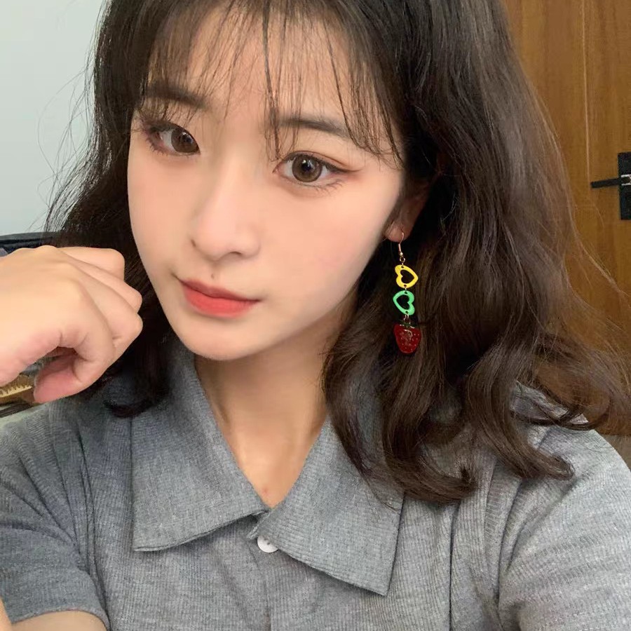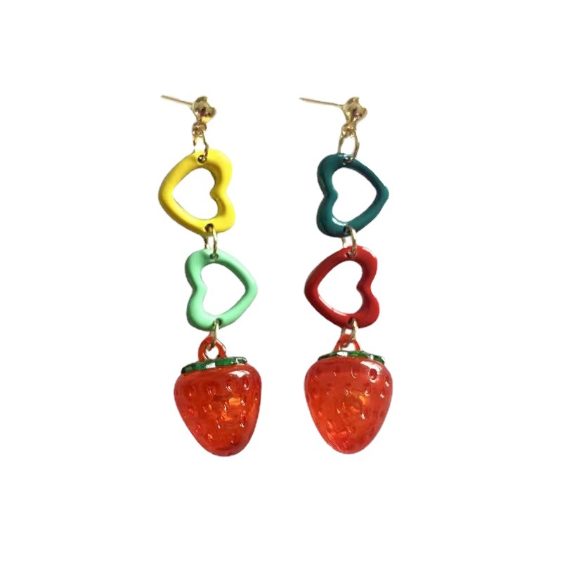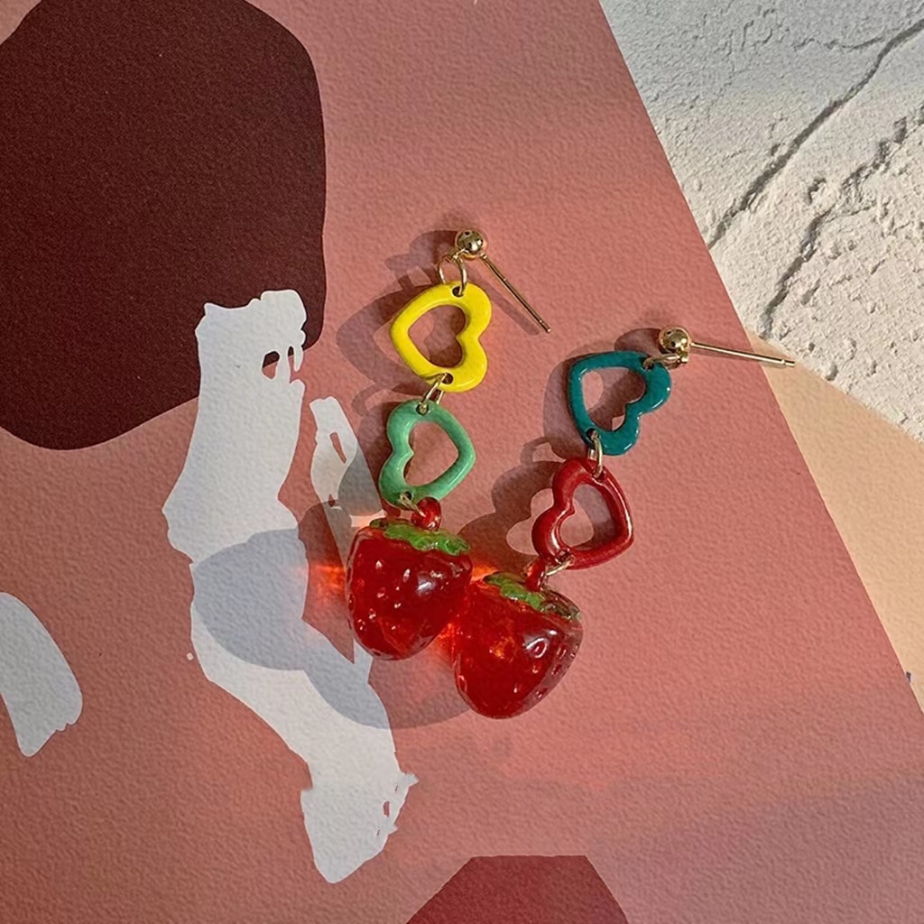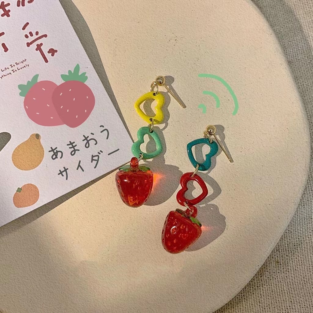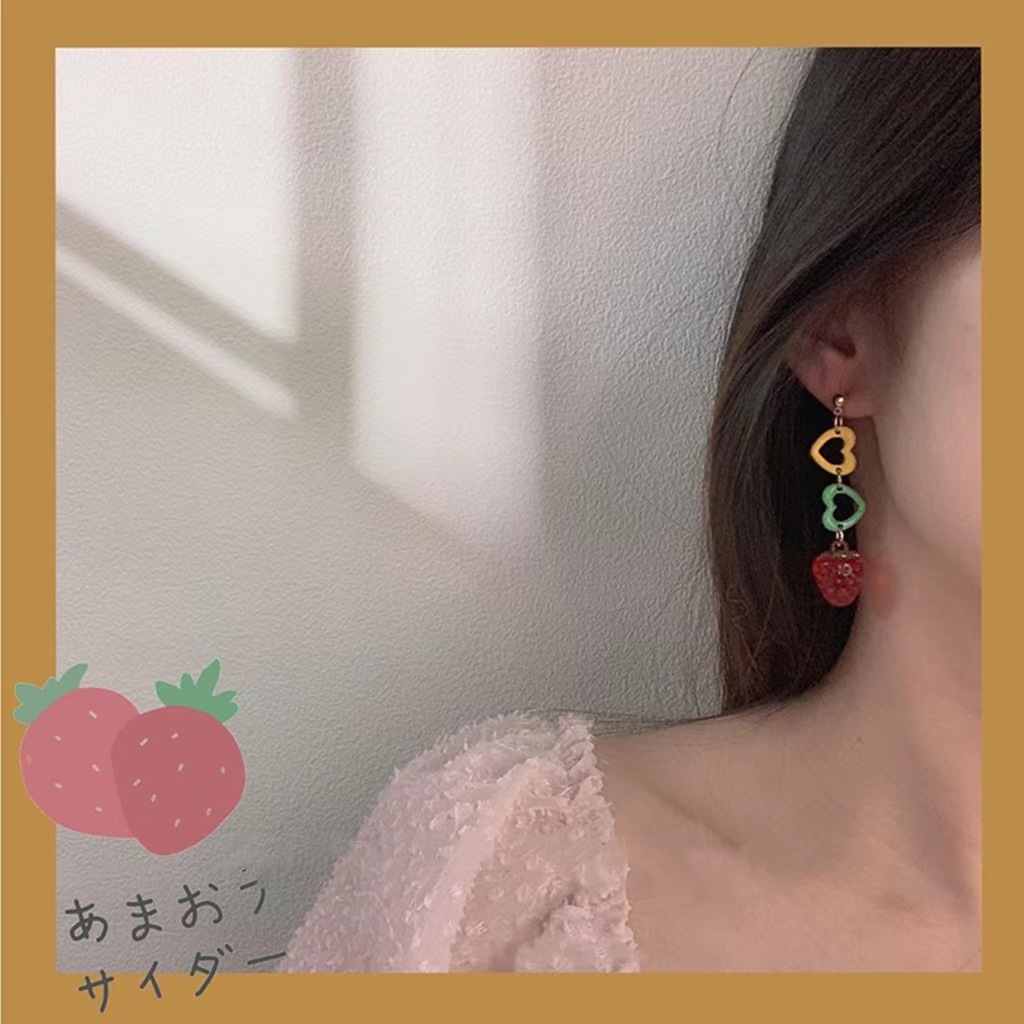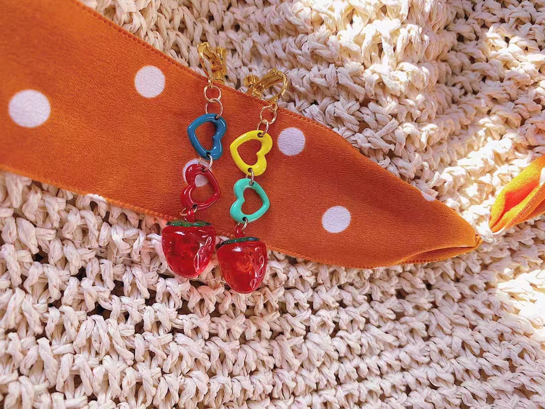 草莓味的你」银针原创无耳洞耳夹不对称撞色爱心耳环少女可爱耳钉