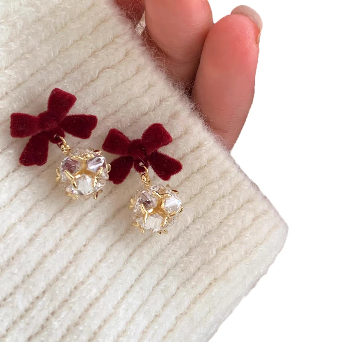 「绫」红色丝绒蝴蝶结耳饰蚊香盘耳夹女无耳洞轻奢耳坠过年耳钉银