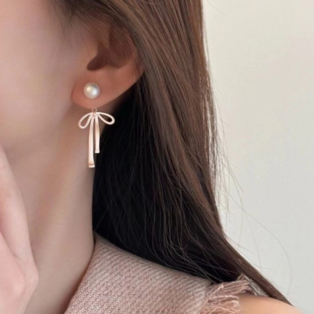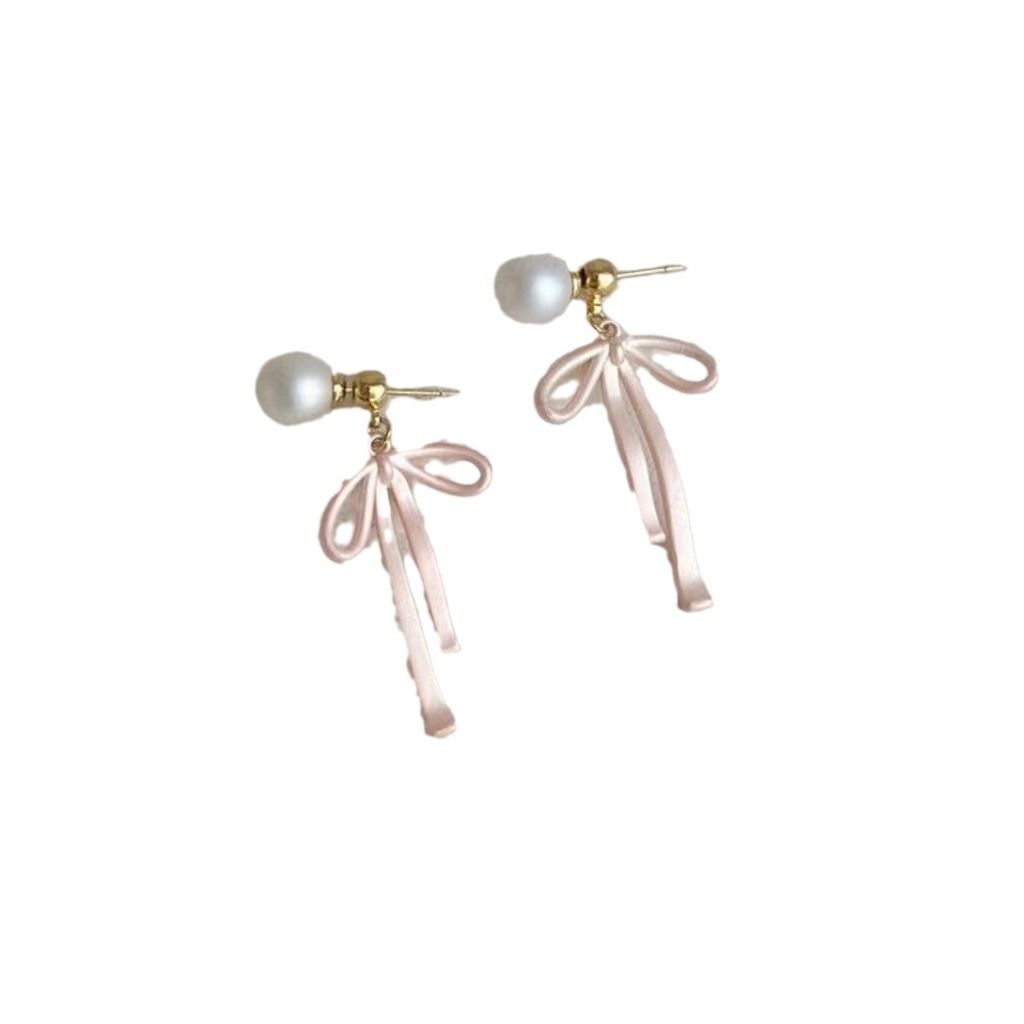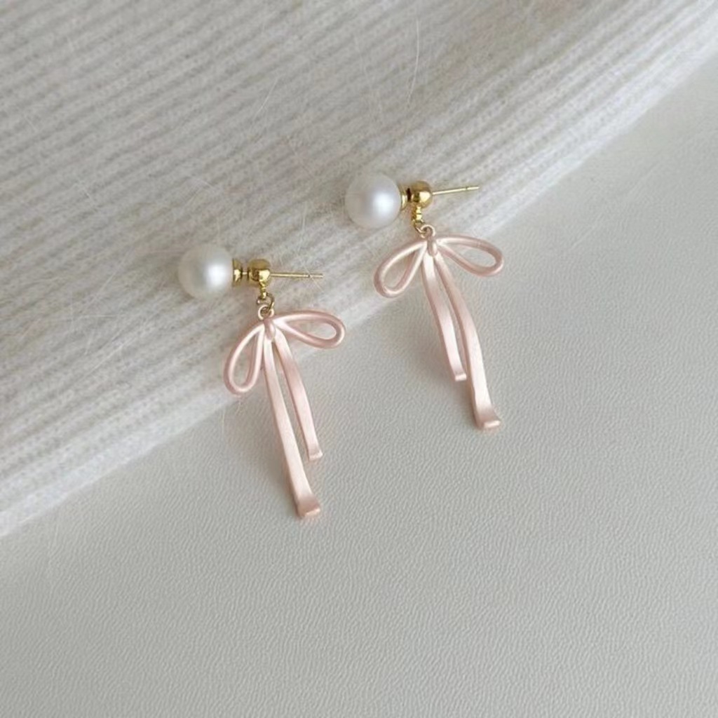 「少女心事」法式粉色蝴蝶结珍珠耳钉女春夏新款轻奢耳饰精致