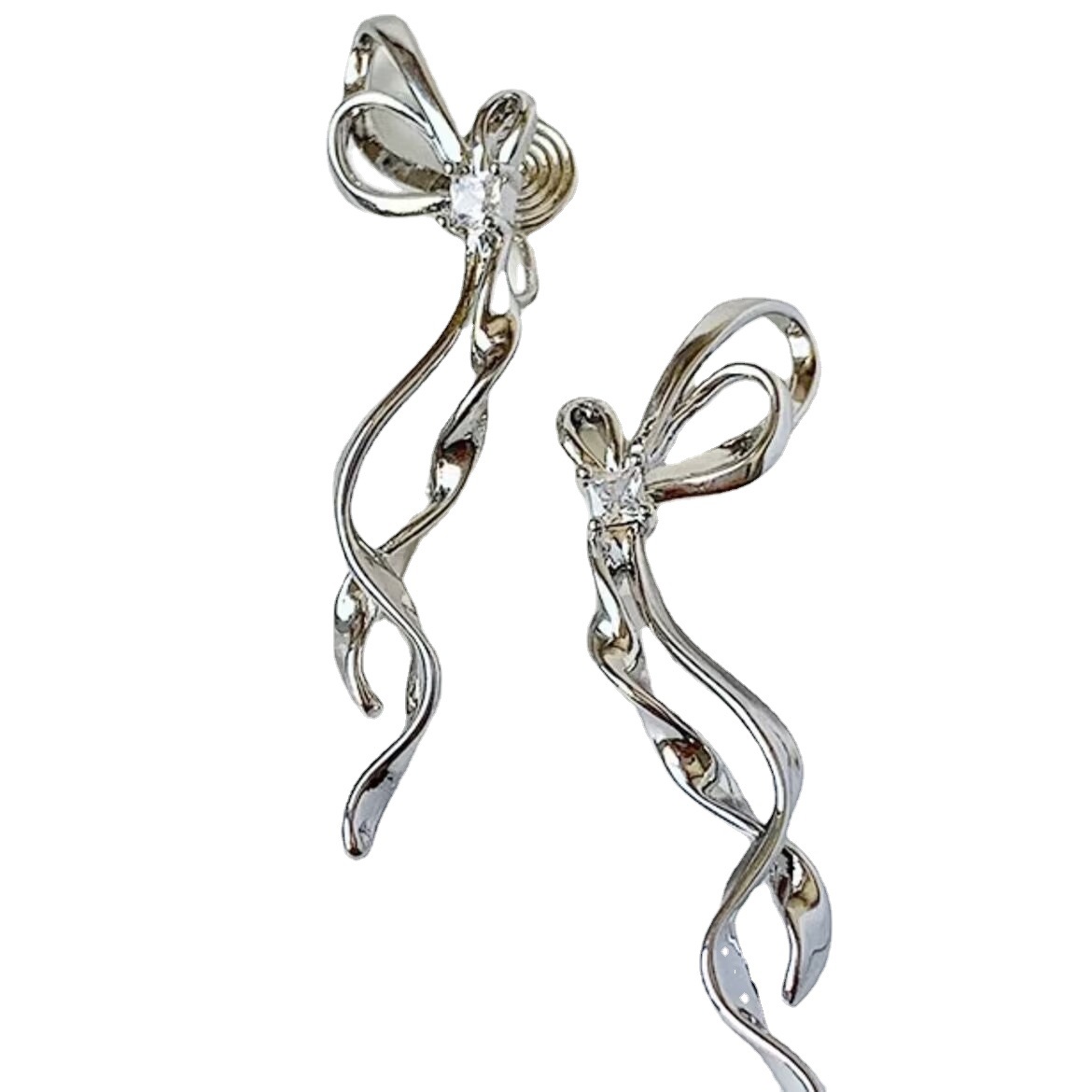 长款银色丝带蝴蝶结耳环小众设计感高级耳钉女气质冷淡ins风耳夹