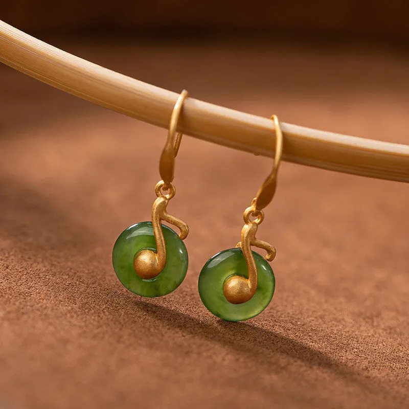 S925纯银镀金白玉碧玉平安扣气质女士音乐符耳环耳饰耳坠送女友