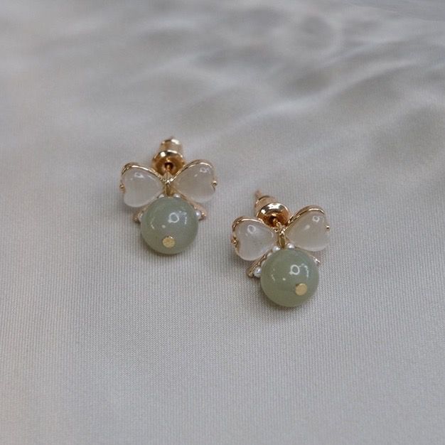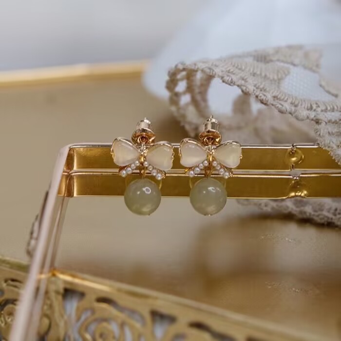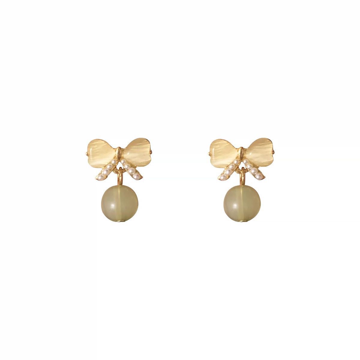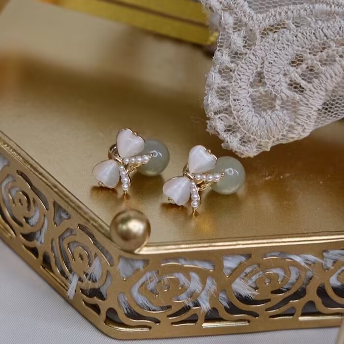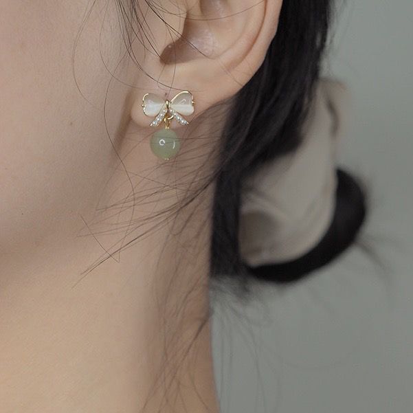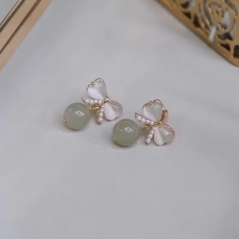 「 温润如玉」温柔气质小众设计珍珠猫眼石高级感绿色耳环耳夹女