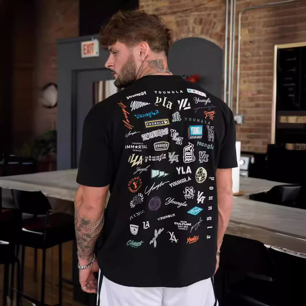 夏季满背印花短袖男宽松240g名人墙 T恤棉圆领休闲健身运动短袖男