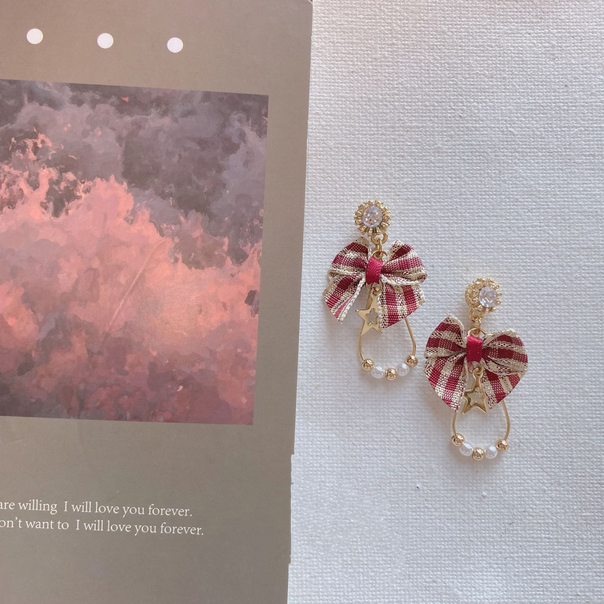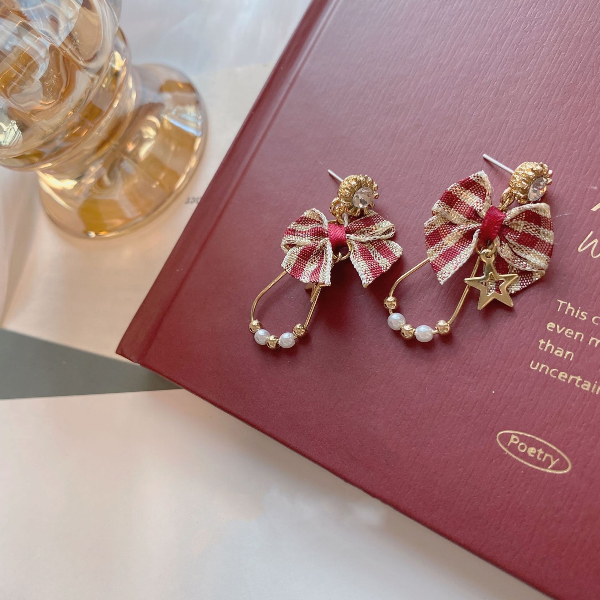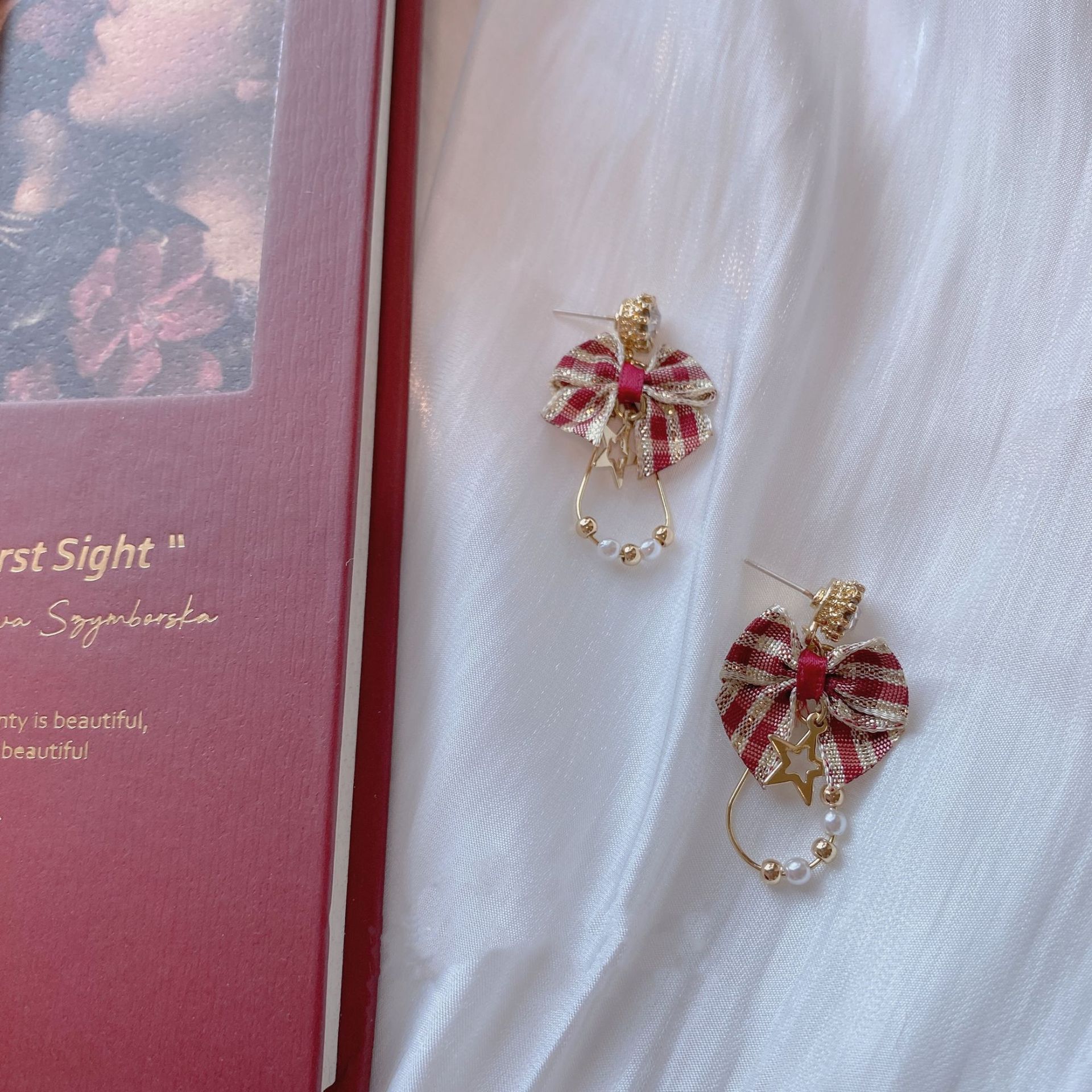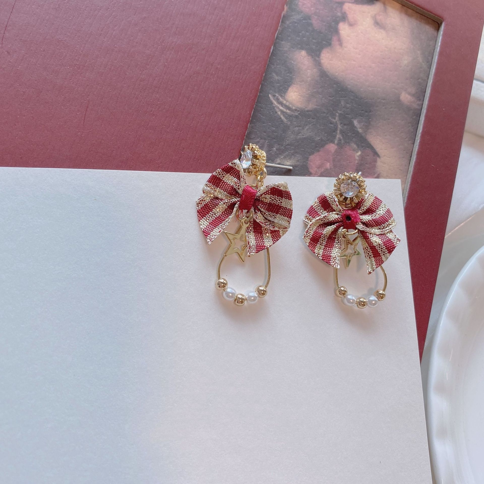 新年红圣诞耳环复古渐欲迷人无耳洞耳夹格子蝴蝶结少女日系可爱风