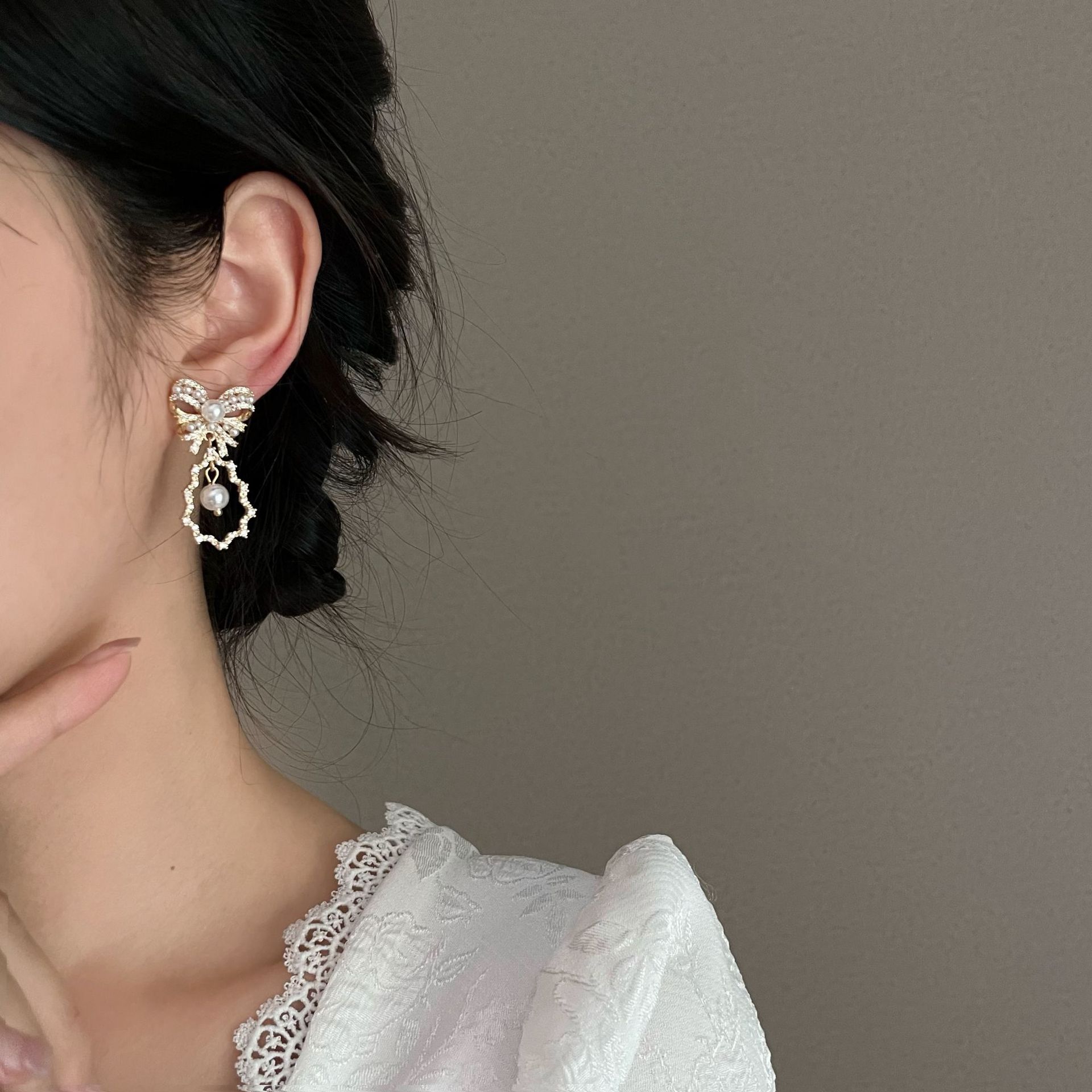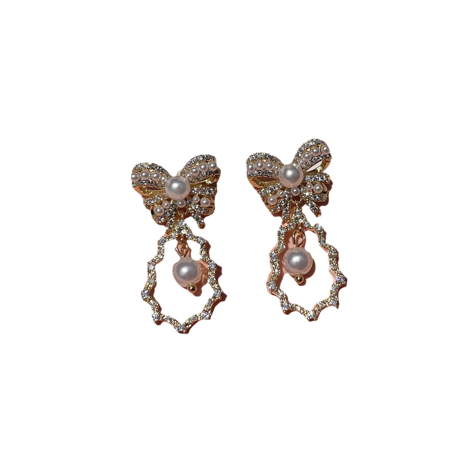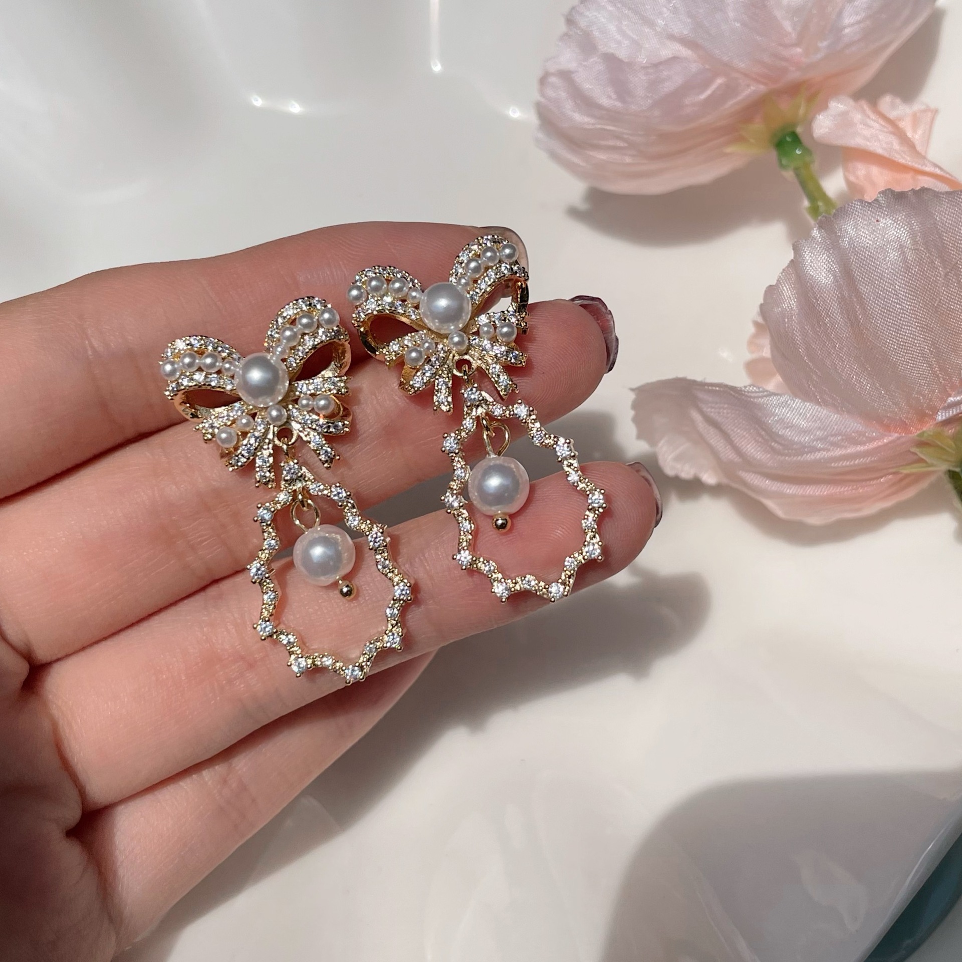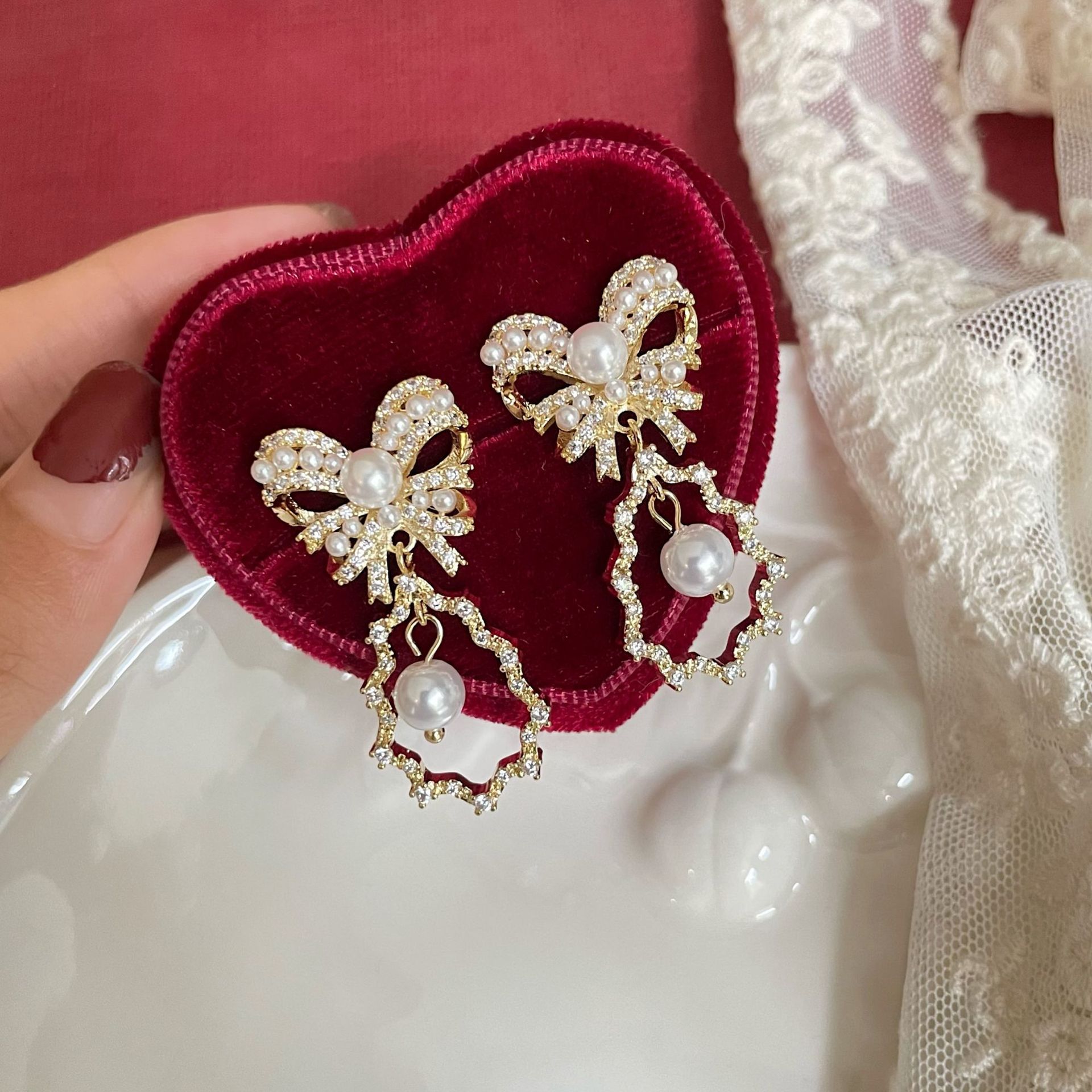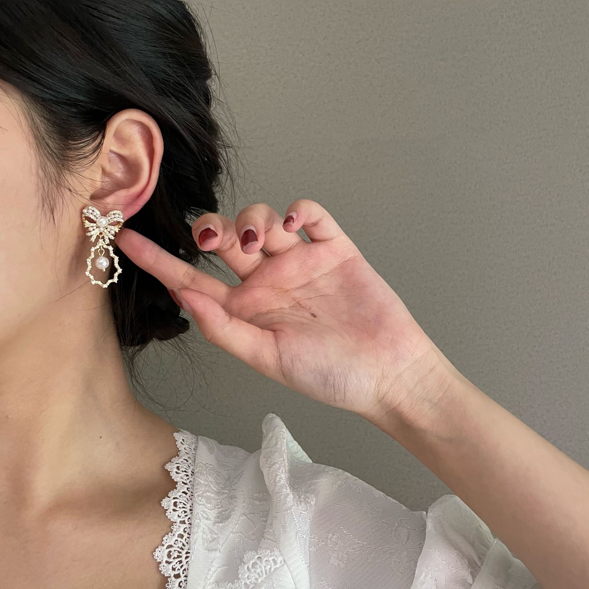 「少女的祈禱」jue美软妹子~法式蝴蝶结满钻珍珠耳坠甜美耳环