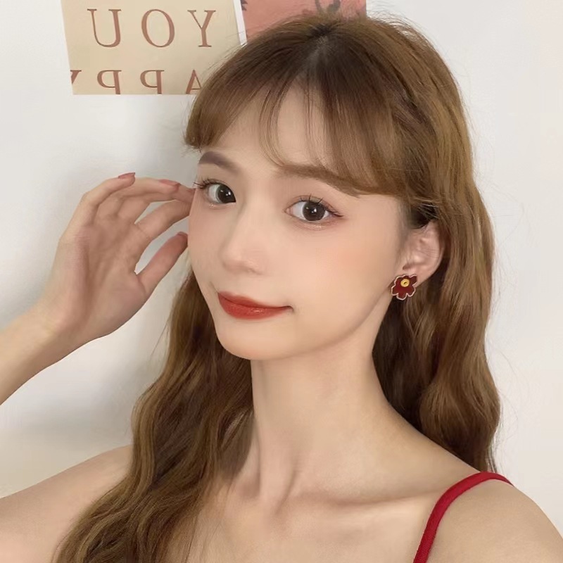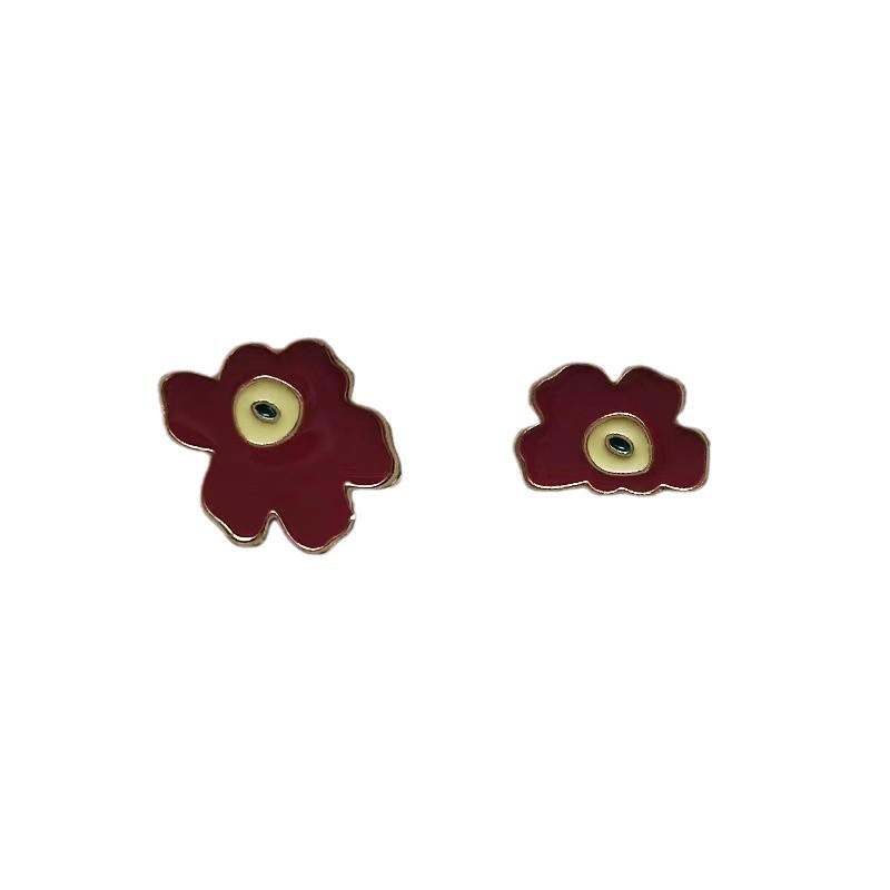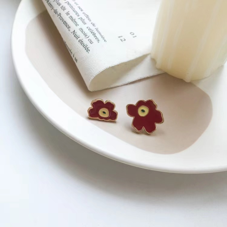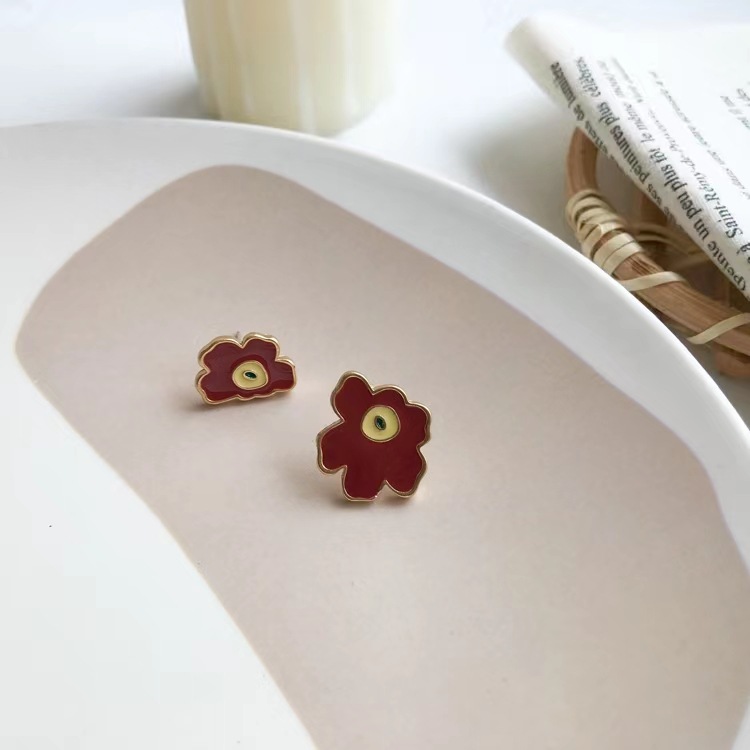 法式少女复古不对称花朵滴釉艺术感耳钉个性撞色气质红色小花耳环