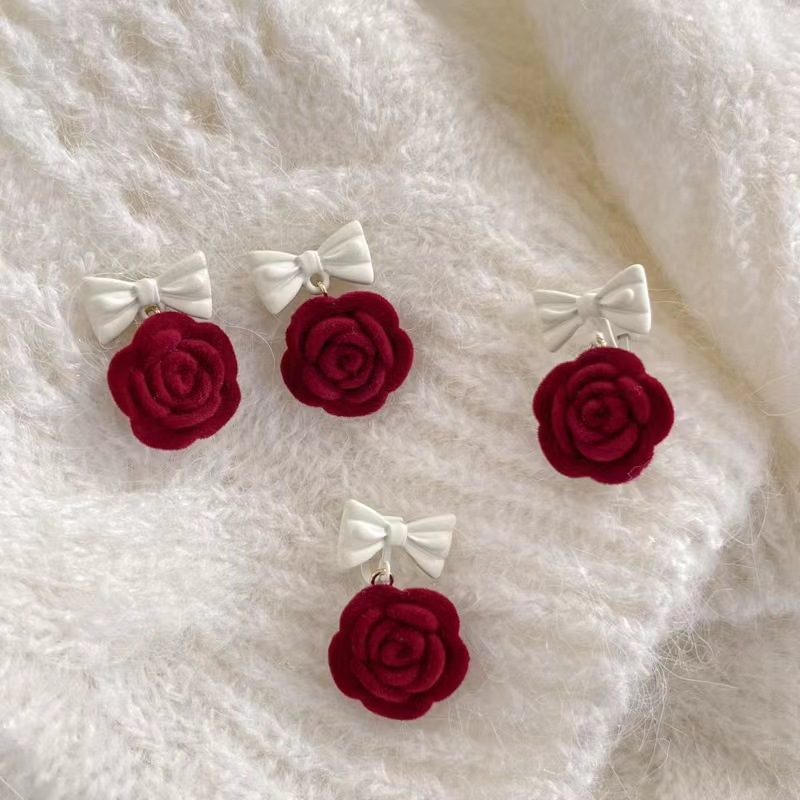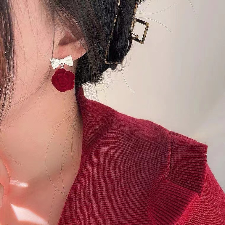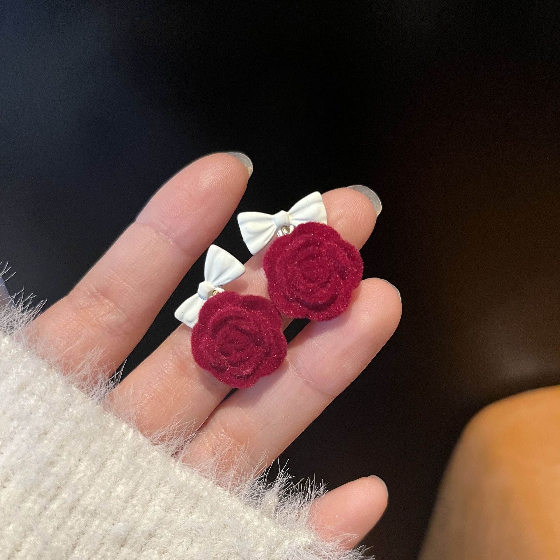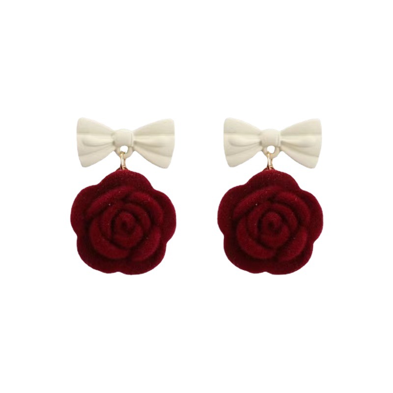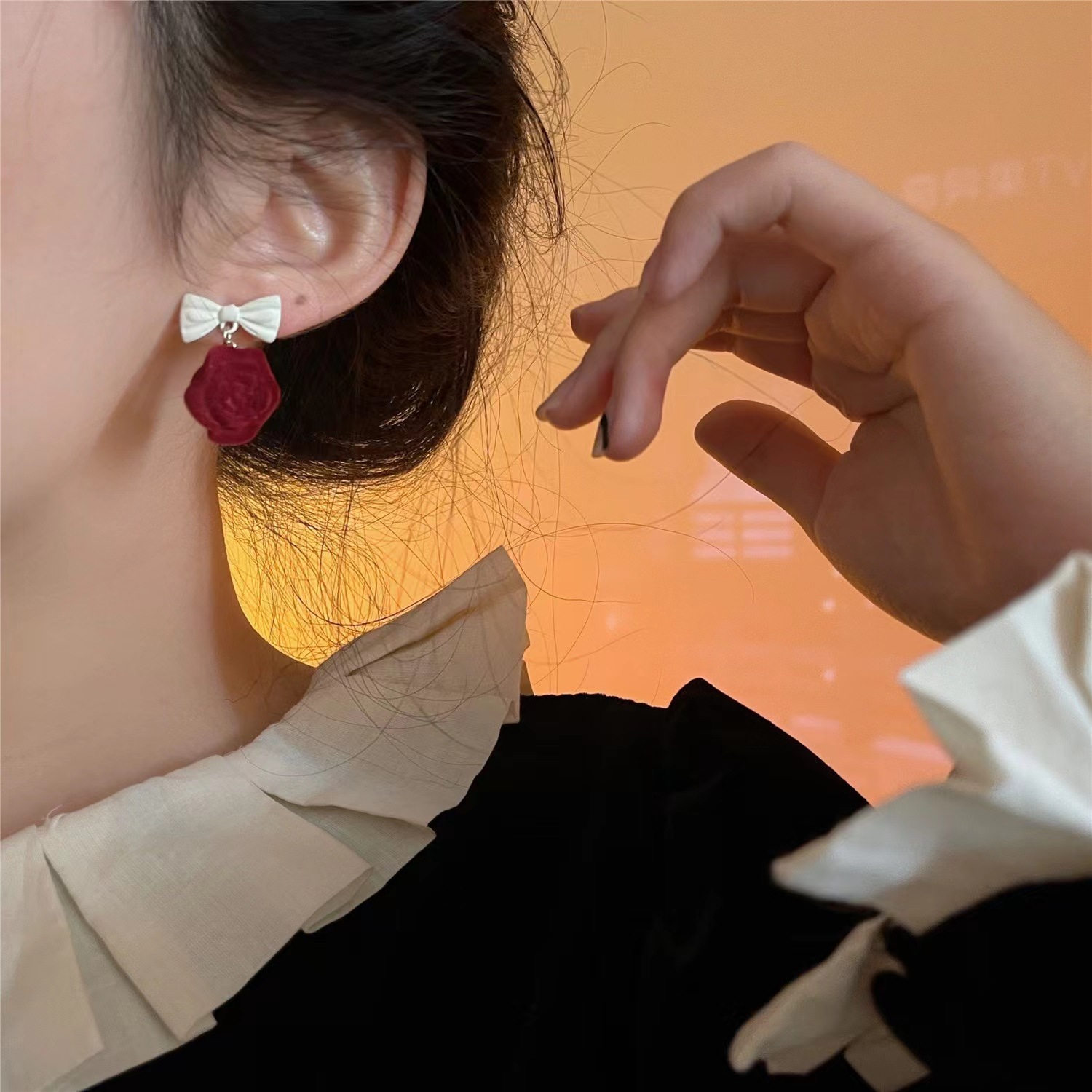 925银针法式温柔酒红茶花耳环秋冬复古蝴蝶结植绒玫瑰花耳饰