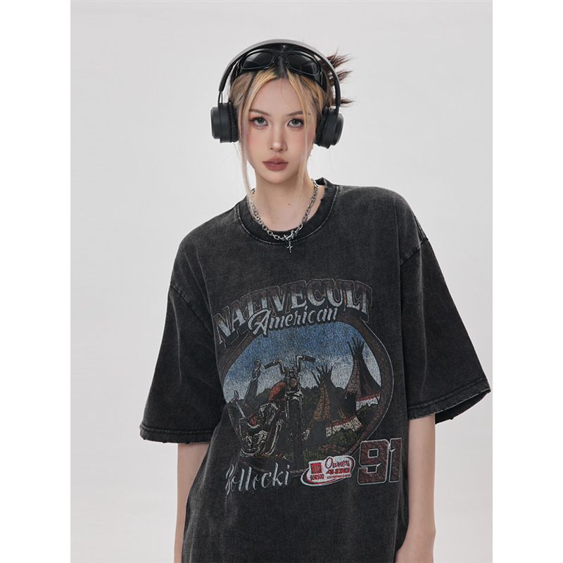 美式复古做旧水洗vintage纯棉短袖t恤女夏季宽松上衣情侣装