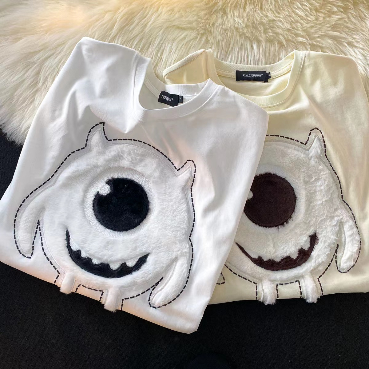 废柴夏季chic设计感小众立体毛绒刺绣卡通短袖女宽松白情侣t恤