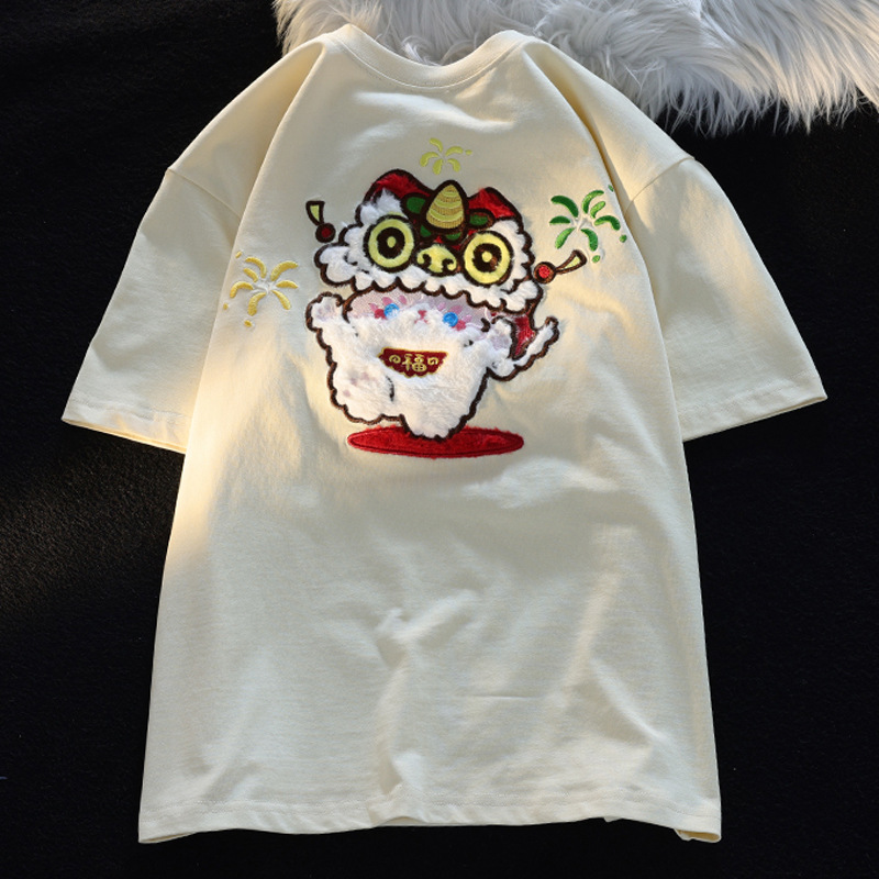 国潮植绒毛巾绣舞狮短袖T恤男女小众设计感bf慵懒风情侣半袖上衣